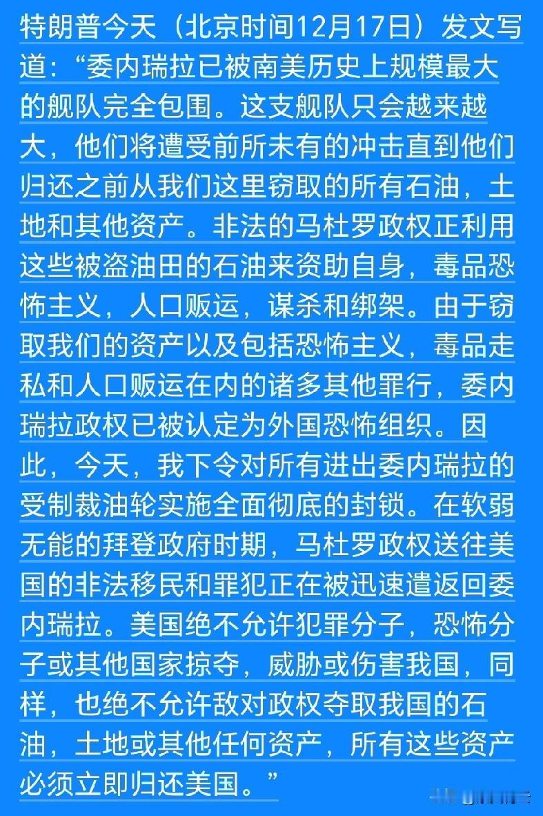 特朗普下令封锁委内瑞拉油轮,看着来势汹汹,其实是精心算计的“软战争”,既想抢资源又不想陷泥潭。 他嘴上喊着要搞地面打击,却迟迟不敢真动手,毕竟美国深陷阿富汗、中东的教训还在眼前。 所以转而用“舰队包围+油轮封锁”的组合拳,掐断委内瑞拉的经济命脉——石油出口是委国主要收入,这么一堵,民生危机只会越来越严重。 更讽刺的是,他给马杜罗政权扣“恐怖组织”帽子,可美方说的所谓“相关组织”根本不存在;遣返移民、制裁油轮,全是服务于自身政治利益的操作。 之前扣押的油轮都要把原油运去美国炼油厂,这哪是追讨“被盗资产”,分明是明抢。特朗普就是想靠这种极限施压,逼委内瑞拉屈服,既掠夺石油资源,又能给自己捞政治资本,把霸权的自私冷血暴露得明明白白! 委内瑞拉战局 委内瑞拉的困境