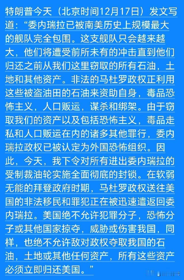 特朗普这波操作太会编了!说委内瑞拉是“恐怖组织”,还派南美最大舰队包围、封锁油轮,打着“缉毒反恐”的旗号,实则全是自欺欺人的谎言。 美国缉毒署自己都承认,委内瑞拉根本不是美国毒品的主要来源地。可特朗普不管这些,先扣帽子再动手,之前已经扣押了一艘载着近200万桶原油的油轮,现在还要全面封锁,说白了就是盯着人家世界第一的石油储量。 所谓“窃取美国资产”更是无稽之谈,委内瑞拉的石油、土地本来就是自己的,哪来“归还”一说?美军在公海击沉所谓“贩毒船”,造成80多人死亡,却拿不出任何涉毒证据,这哪里是缉毒,分明是海盗行径。 打着正义旗号干掠夺勾当,用莫须有的罪名打压主权国家,特朗普这套霸权剧本,全世界都看腻了! 委内瑞拉战局 委内瑞拉的困境 委瑞瑞拉局势