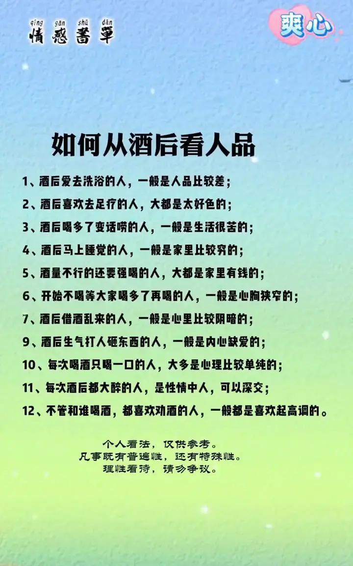 刷到个帖子说“酒品即人品”,把喝醉后干啥分门别类,连去洗浴都算标签,点赞飙到几十万。 我寻思这不就是酒桌八卦升级版嘛。 有人醉了就睡,被夸情绪稳定;有人话多,被说压抑太久;最惨是断片发酒疯,直接被判责任心零分。 评论区里,有人拿前男友酒后骂娘说事,说早该看清;也有人替自己辩解,社畜陪领导喝吐还要背锅,难道一次失态就盖棺定论? 北师大老师出来降温,酒精只是关掉刹车,不是打开灵魂,人格得长期观察。 我点头,想起我表哥,平时闷葫芦,三杯下肚给全家发红包,第二天醒来抠门依旧,难道他隐藏属性是散财童子? 要真靠一杯酒识人,HR能省多少背调钱,民政局也能摆酒桌代替结婚证了。 把醉酒当照妖镜,图个乐就行,真拿来判人品,比酒后断片还离谱。