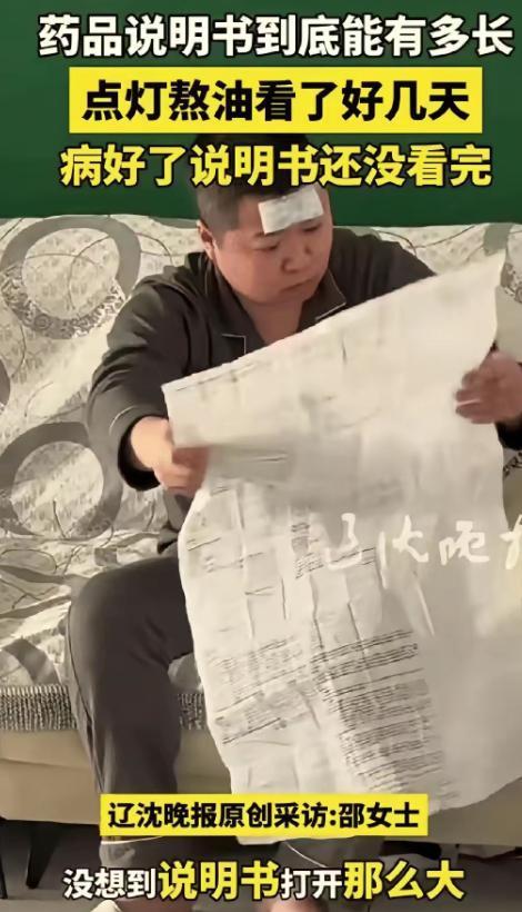 “笑不活了!”辽宁,一男子感冒了准备吃药,想看一下说明书,没想到一打开直接傻眼了,点灯熬油看了几天,病都快好了,说明书还没看完。 王先生是沈阳一家互联网公司的,半个月前加班到晚上八点多,下班时浑身发冷,测体温38.5度。 不想去医院排队,就下楼买了盒退烧药,琢磨着吃两粒睡一觉就好。 可拆开药盒,说明书一展开他就傻了——比A4纸还宽,铺在茶几上占了大半地方,上面全是“对乙酰氨基酚”这类看不懂的词,连翻五遍都没找到“一次吃几粒”。 他也是个较真的人,觉得吃药不能含糊,剂量错了更麻烦。 于是从那天起,说明书成了他的“随身必备”:地铁上掏出来看两行,遇到不认识的专业词就用手机查。 午休时同事刷视频,他坐在工位上逐字读,晚上回家就着台灯看到十一点,眼睛酸得流泪才放下。 结果三天过去,药没吃一粒,光靠多喝热水,他的烧居然自己退了,周一正常上班。 可那本说明书,才看到“不良反应”中间部分,最后还是打电话问药师,才知道成人一次1粒、一天最多3次。 他把这段经历拍成视频,网友们的评论瞬间炸了锅,有人说“我上次牙疼买的药,说明书比小说还长,看两天病好了”。 还有人说“我爷爷看说明书,老花镜加放大镜都看不清,只能凭感觉吃”,笑着笑着就觉得揪心,这哪儿是说明书,分明是“拦路虎”。 北京有位72岁的大爷,有糖尿病和高血压,儿子买的新降压药,说明书上“糖尿病患者慎用”的字太小,他没看清,吃三天就头晕心慌送医。 年轻人没耐心看,凭经验吃药容易忽略禁忌,宝妈给孩子喂药,得按体重换算剂量,对着公式一头雾水。 上班族对着“药代动力学”这些词犯愁,琢磨半天也不懂,老年人视力下降,“慎用”“酌减”根本看不清。 有调查说,不到20%的人能准确理解“顿服”“酌减”这些表述,想想都觉得后怕。 为啥说明书会变成这副模样?其实说白了,药企怕担责,哪怕万分之一概率的不良反应也得列上,相当于“免责符”。 国家规定要标注完整信息,却没说要区分专业和通俗内容,药盒空间有限,只能缩小字体、压缩行距。 放大字体要多花三四倍纸张成本,厂家不愿承担。 不过也不是没办法解决,美国的说明书是“双栏设计”,左边用大号字体写用法用量、禁忌,一页纸搞定,右边是专业人士看的药理数据。 咱们国内也在改革,2023年国家药监局推出了试点方案,现在已有1765个药品参与,有的药企把字体从8号调到4号,关键信息加粗。 有的做了简化版,就一张小纸条,只写用法用量、禁忌、注意事项,可问题还是存在,试点范围太小,很多常用药没覆盖。 有些药企只是简单放大字体,核心信息依然不突出,视障人士需要的语音版、盲文版几乎没有。 不同品牌说明书格式不一,换着吃不便,其实老百姓买药就是为了治病,不是为了学药理知识。 大家想要的真的很简单:字体大一点,能看清;内容简一点,能看懂;重点明一点,能找到。 那些复杂的成分分析、临床数据,留给医生和专业人士研究就好。 希望药企能多站在消费者角度想想,别只盯着合规和成本,相关部门能加大改革力度,扩大试点、制定统一标准。 对此,有网友表示,“看文章狠狠共情了!我奶奶有高血压,每次拿新药都要让我逐字读说明书,‘心功能不全者慎用’这种表述,连我都要查半天,更别说老人了。” 还有网友表示,“儿童用药剂量换算真的坑!我家娃 25 斤,说明书标‘每公斤 5 毫克’,算来算去怕错,最后还是跑医院问医生,为啥不能直接整个体重对应表?” 罕见病家属表示,进口药说明书直译得像天书,‘细胞色素 P450 酶代谢’这种词,查完文献都没弄明白,就不能出个通俗版? 为德国定制化说明书点赞!希望国内赶紧跟进,老年人要大字版,慢性病患者要合并用药提示,不同人需求不一样啊。 试点改革挺好,但好多常用药还没覆盖,上次买的消炎药还是小字体,核心禁忌藏在最后,真怕漏看出事。 也有网友表示,农村老人的数字鸿沟不能忽视!我爸妈不会扫码,智能终端再好用也用不上,还是得有纸质大字版才实在。 那么到最后,你们是怎么看的呢? 如果各位看官老爷们已经选择阅读了此文,麻烦您点一下关注,既方便您进行讨论和分享,又能带来不一样的参与感,感谢各位看官老爷们的支持!