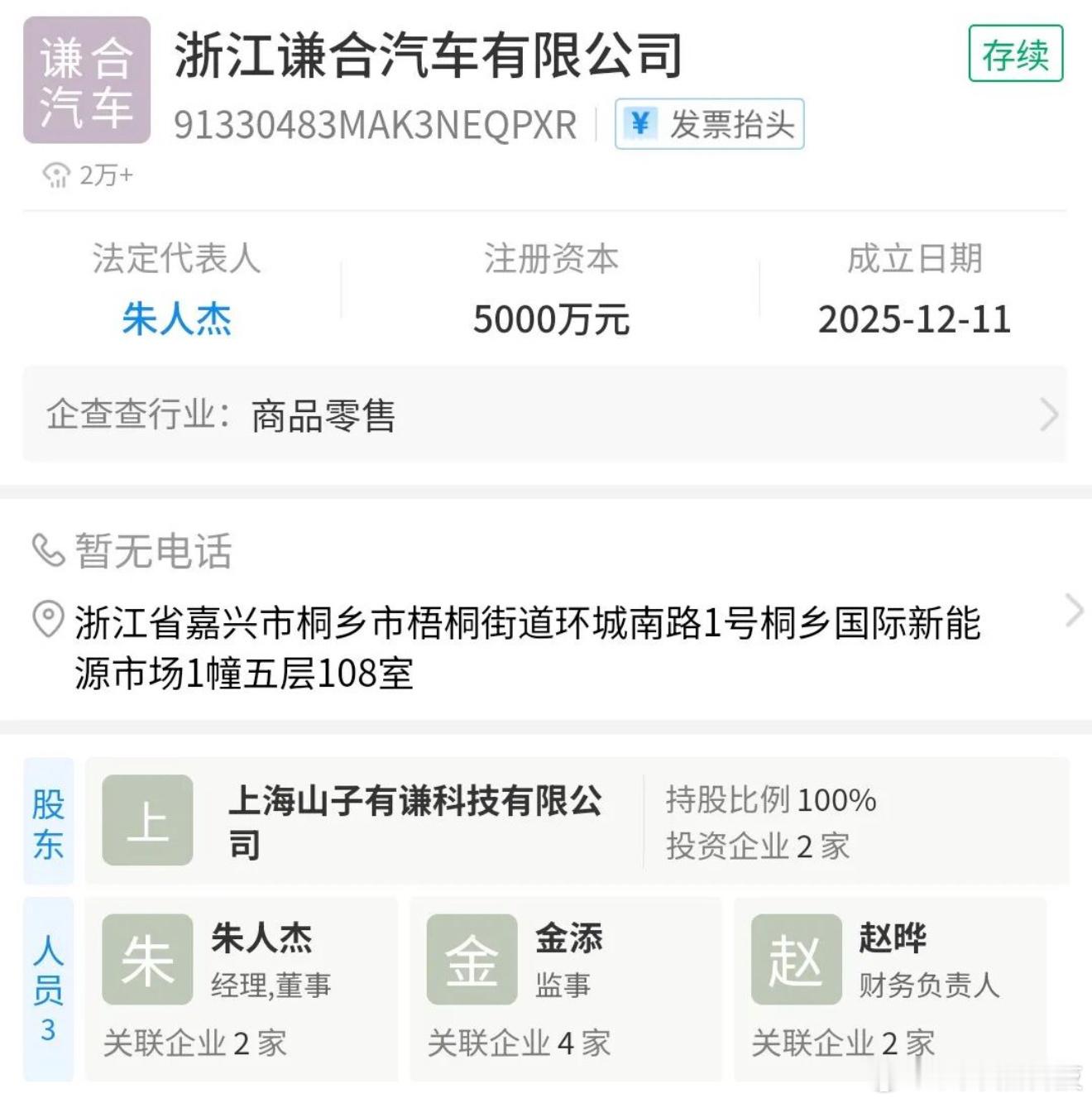 谦合汽车成立 近日,谦合汽车正式成立,法定代表人为朱人杰,由上海山子有谦科技有限公司全资控股。【与哪吒汽车的关联线索】业内猜测谦合汽车或为哪吒汽车的关联企业,主要依据有三:关键人物重叠:浙江谦合的实际控制人章玉明与哪吒母公司(浙江合众)存在历史交集。浙江山子有谦汽车有限公司(成立于2017年)经营范围包括新能源汽车销售、电池研发等,与哪吒业务高度重合;地域关联:多家爆料指向谦合汽车注册地嘉兴桐乡,与哪吒汽车总部(桐乡)一致;“山子高科、朱人杰” 等关键词半年内频繁出现在哪吒相关传闻中,被解读为品牌重组或新业务线铺垫。