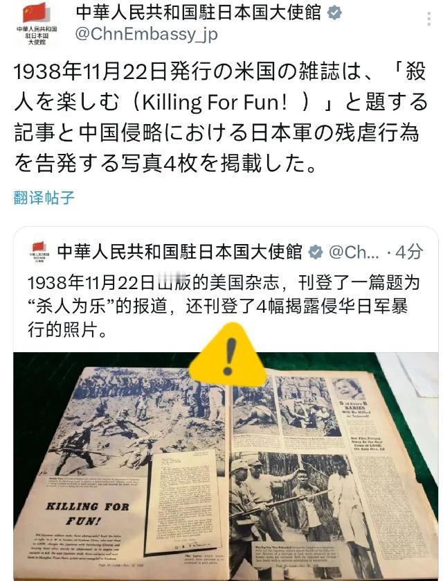 就在刚刚, 中国驻日本大使馆正式宣布, 12月16日,中国驻日本大使馆用中日文双语写道:“1938年11月22日出版的美国杂志,刊登了一篇题为‘杀人为乐’的报道,还刊登了4幅揭露侵华日军暴行的照片。” 这不是翻旧账,而是敲响警钟,这不是中国自己的叙述,而是来自当年美国媒体的亲历记录。 这条信息公布的时机,绝非偶然,就在日本右翼加紧向“台独”势力靠拢、与美国举行大规模联合军演的当口,中国选择用历史铁证正面回应现实挑衅。 一方面,告诉世人“这段历史我们没有忘”;另一方面,也在警示——今天某些国家的举动,和当年的“野心”如出一辙。 1938年11月,美国某期刊刊登了题为《杀人为乐》的深度报道,配图4张,全部记录的是日军在中国的真实行径。 不是传说,不是口述,是战地记者亲眼看到、亲手拍下的画面。 这份报道的重点,不是中国官方的控诉,而是第三方,也就是当年的美国媒体,用镜头和文字记录下的证据。 这个报道,不仅有照片,还有战地记者对日军在南京等地“以杀人为乐”的详细描述。 甚至连日本军官比赛砍人头的细节,都被写得清清楚楚,这样的内容,今天读来依旧令人发指。 这份报道的真实性,还能在魏特琳的日记里找到佐证。 魏特琳是南京大屠杀期间在场的美国传教士,每天都记录日军暴行。她在1937年12月16日的日记中,写下了当时的恐惧与血腥。 这份日记,如今被南京大学档案馆完整保存,成为国际公认的历史证据。 这不是中国“自说自话”,是当年美国人亲手留下的“实况录像”。 就在中国公布这段历史的一周前,安倍宽信率团“窜访”台湾,签了份所谓“民间安全合作备忘录”,说是“非官方”,但内容却直指军事合作。 台当局更放话,2026年8月要派人参访日本防卫省,合作进一步“上台阶”。 同时,美国和日本刚刚才结束了“利剑-2025”联合军演。 这次演习规模不小,3.2万人参加,台海方向被首次列为核心科目,还安排了航母协同演练,这个动作,谁都看得出来剑指何方。 更值得注意的是,日本政坛右翼人物高市早苗,不久前密集访问印度、越南、菲律宾,签署了一系列安全合作协议。 这些协议,背后的关键词是“情报共享”“区域协防”,而台海问题频频出现在会谈内容中。 这些动作拼在一起,像不像当年那套“先东北,后华北,再吞并”的老剧本重新上演? 从1930年代的“军国主义扩张”,到今天的“联合军演加外交串联”,日本右翼的战略逻辑几乎没变。 唯一不同的是,那时候他们靠军刀推进,现在则用“安全合作”“地区稳定”这些词做包装。 日本右翼至今没有真正完成对战争历史的反省,日本教科书审定制度每年都在“动刀”,把“侵略”换成“进入”,把“屠杀”改成“冲突”,连“南京大屠杀”都想模糊成“中日战斗”。 数据也显示,日本文部科学省审查通过的教科书中,超过六成已不再使用“侵略”描述对中国的战争行为。 40岁以下日本人中,有超过一半不清楚“南京大屠杀”的具体内容,这意味着,日本右翼正利用公众对历史的模糊,推动“军事正常化”“对外扩张”的现实政策。 今天的日本,不是没有记忆,而是选择性地遗忘,更糟的是,这种遗忘正被有心人当作筹码,走回老路。 这次中国驻日大使馆双语发布照片和史料,显然不是偶然的“回顾历史”,中方明确指出,这是对当前日本右翼挑衅的一种回应,也是对日本民众的一次提醒。 从语言上看,大使馆并没有使用激烈措辞,也没有情绪化表达,反而用事实说话,用历史说话。 这种方式,其实是希望打破日本国内的信息封锁,让更多普通百姓知道,自己国家曾经做过什么。 这次公布,不是为了延续仇恨,而是为了防止历史悲剧重演,记住历史,不是为了报仇,而是为了和平。 美国媒体的历史档案,在今天这个节点被再次摆上台面,也具有特别意义,它是第三方证据,是国际社会无法回避的“底牌”。 二战后,国际社会建立起的和平秩序,核心是“反对侵略、尊重历史”,但今天,这套秩序正在被挑战。 日本右翼一边否认历史,一边推动现实扩张,这种“双面操作”,才是最危险的信号。 《外交事务》期刊曾有文章指出,日本右翼正在利用中美之间的博弈空间,试图“偷渡”自己的战略目标。 台海局势越紧张,日本介入的空间就越大,这种“坐收渔利”的思路,和上世纪30年代如出一辙。 中国这次的回应,不是简单的历史重提,而是战略清醒的表现。 既不选择沉默,也不搞情绪宣泄,而是用最扎实的证据说话。 这背后,是一种对历史的敬畏,更是对未来的负责。 今天的世界,已经不是1945年,但如果我们对历史掉以轻心,未来也可能再次黑暗。 和平,从来都不是免费的午餐,它需要每一个国家、每一个人,对历史有清醒认识,对现实有警觉判断,否则,历史就有可能以另一种方式,再次上演。 信源:中华人民共和国驻日本国大使馆2025-12-16