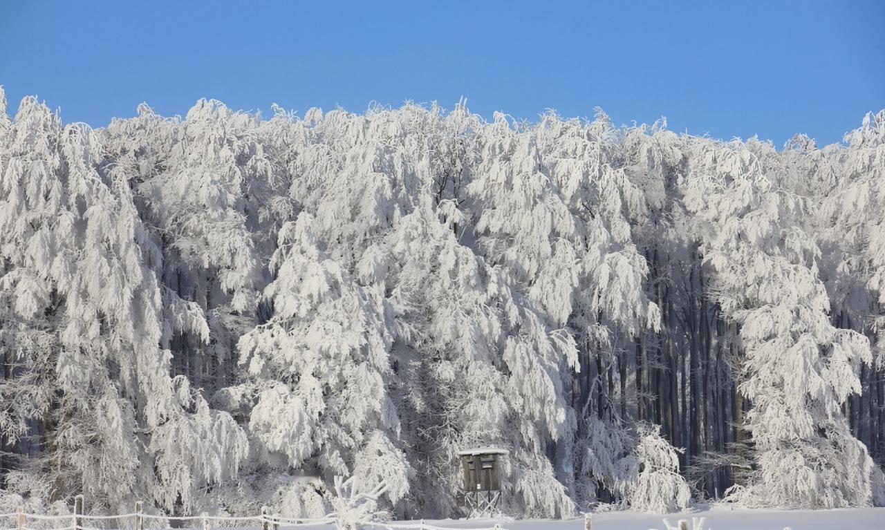 分享一张治愈系风景吧树上挂满了雪,蓝天映衬着雾凇,真好看。