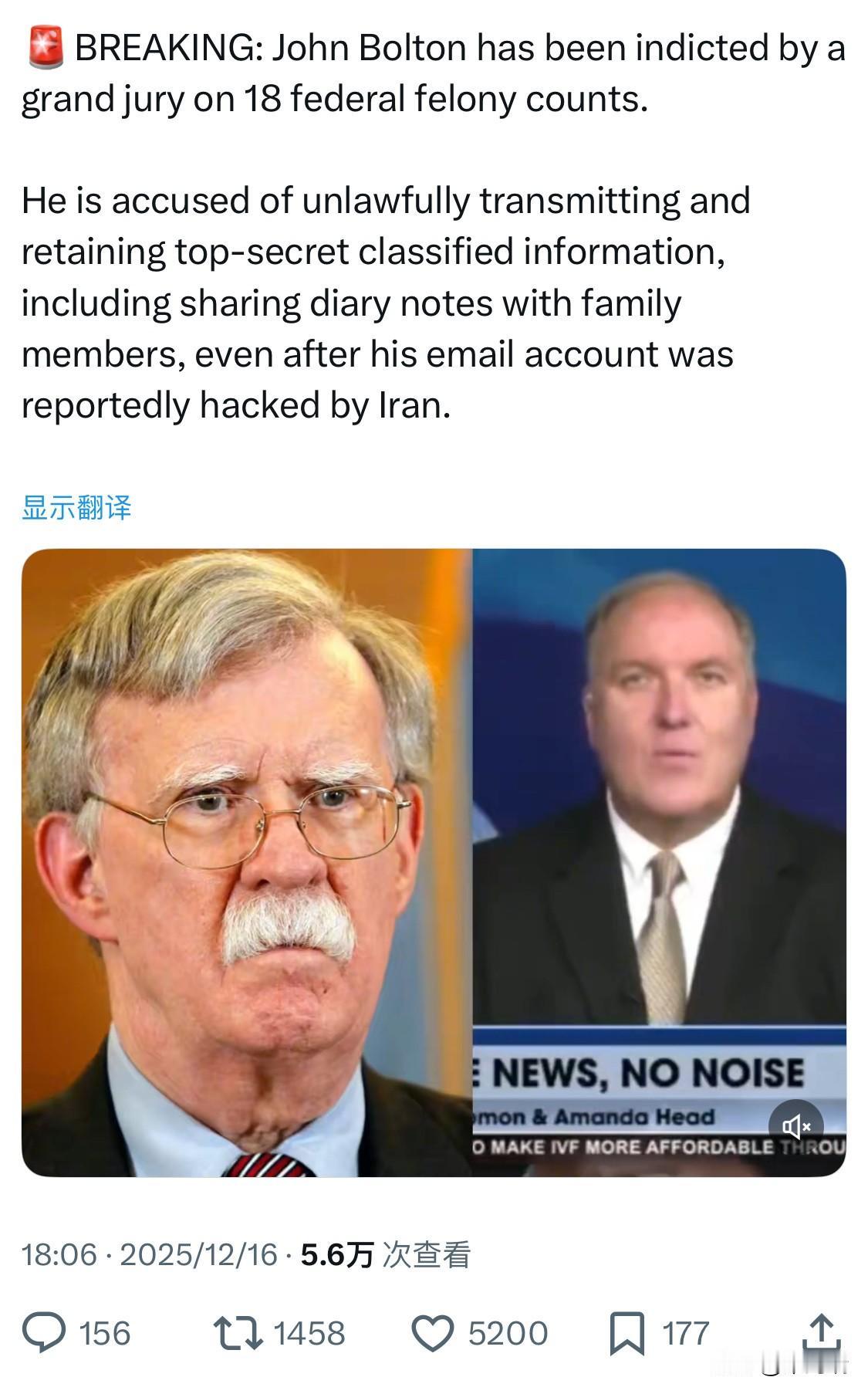 前国家安全顾问约翰·博尔顿(John Bolton)已被大陪审团起诉,罪名涉及非法传输和保留机密信息。 案件详情 博尔顿面临18项联邦重罪指控,包括8项传输国防信息罪和10项非法保留国防信息罪。 指控称,博尔顿滥用职权,通过个人非政府电子邮件账户(如AOL和Google),与两名未经授权的家庭成员分享了“一千多页”的“日记式条目”。 这些信息包含最高机密(TOP SECRET)级别及敏感隔间信息(SCI)。 调查始于2022年,此前博尔顿的电子邮件账户据报被伊朗黑客入侵。 博尔顿已在马里兰州联邦法院对所有指控表示不认罪。