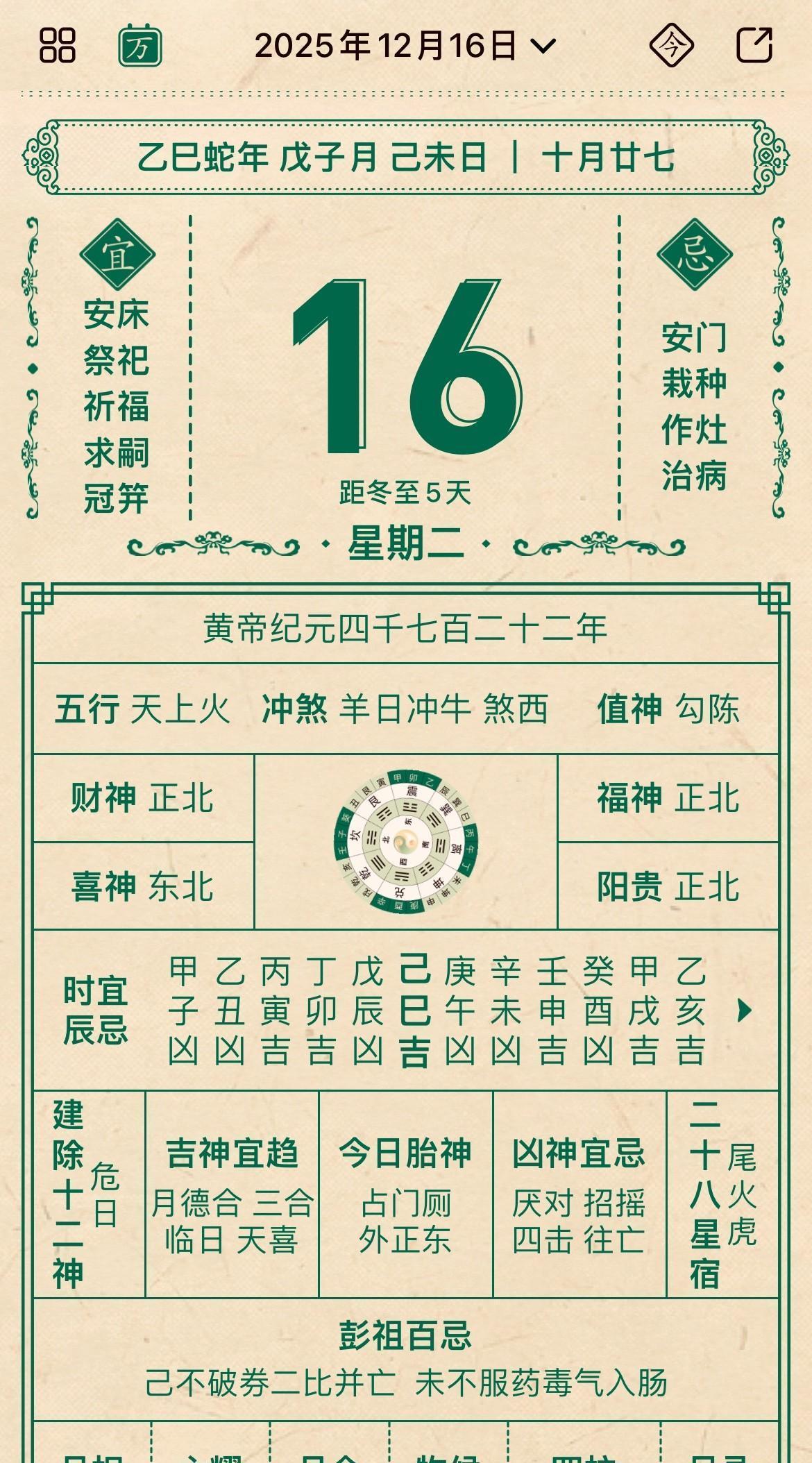 2025年12月16日每日黄历 办公桌一角的台历上,“忌安门”的红色字体被圈了又画,旁边潦草写着“装修队已到楼下”——传统民俗与现代节奏的碰撞,从翻开日历的清晨就开始了。 宜安床、祭祀,忌安门、动土——这些用朱砂写就的禁忌,在今天的装修工地格外显眼。包工头老李对着“煞西”的标注皱眉,他手下两个属牛的工人正蹲在墙角啃馒头,“冲太岁”的提醒让他们今天连脚手架都不敢往西边搭。 吉时集中在子、丑、卯、午、酉时,有人特意把重要的安床仪式定在凌晨1点的乙丑时,闹钟已经调好;也有人对着“丙寅时凶”的标注叹气,原本约好的7点会议不得不改期。 但真的有必要为“煞西”避开整个西方位吗?年轻的设计师小王在图纸上画了个问号,他刚用罗盘测过,办公室西边靠窗的位置采光最好,“总不能让客户坐东边喝西北风吧?” 有人觉得这是老黄历的迷信,却在签约前下意识翻到“己不破券”的提醒——彭祖百忌里的“二比并亡”警告,像根细刺扎在心头。财务室的张姐今天拒签了三份合同,“宁可信其有,万一呢?” 财神和福神都在正北,有人默默把钱包转向北方,仿佛这样就能接住好运;喜神在东北,准备表白的小伙子特意绕到公司东北门等电梯,连呼吸都带着点仪式感。 距冬至还有5天,孟冬的风里带着虎始交的物候信号,传统历法总把自然节律和人事绑在一起。手机天气APP显示“晴,-3℃”,而黄历上“虎始交”的注脚,让这冷天多了层生命萌动的暖意。 “勾陈值日防文书纠纷”的特别提示被贴在会议室门口,法务部的同事路过时拍了拍年轻律师的肩:“今天审合同,逐字逐句看。”属牛的项目经理则把黑曜石手链攥得更紧,他说这是母亲凌晨特意从老家寄来的,“老人家说比啥都管用”。 这些带着泥土气息的规矩,其实是古人对时间的敬畏——把抽象的时间划分成可感知的“吉”与“凶”,本质是给无常的生活找个锚点。就像今天的“月德合三合吉神”,与其说是运势加持,不如说是给焦虑的现代人递了颗定心丸。 短期看,安床选吉时、签约避破券或许只是心理安慰;长期而言,这些从黄帝纪元延续至今的符号,早成了刻在文化里的密码。 手机日历滑动到12月16日,“孟冬”二字与窗外的冷霜相叠,有人对着“宜祭祀”的标注备了束菊花,有人盯着“忌作灶”的提醒点了外卖——老黄历和电子屏,原来早就在现代人的生活里,悄悄和解了。