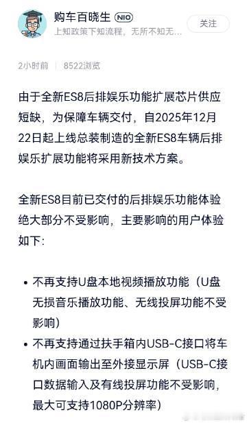 蔚来ES8又遇上“缺芯”了为了保证交付,从12/22开始下线的新车,车内的USB接口功能和造型会有一些调整(见图2)。 功能方面的区别主要有两个: 1、不再支持U盘本地视频播放功能 2、不再支持通过扶手箱内USB-C接口将车机内画面输出至外接显示屏 对于2025年12月31日前锁单的用户,蔚来会车辆交付后3日内,一次性补偿15,000积分。 如果车主想后期升级USB接口,也可以在相关芯片供应改善后,支付12,000积分(或1,200元)进行后装。【来自懂车帝车友圈】