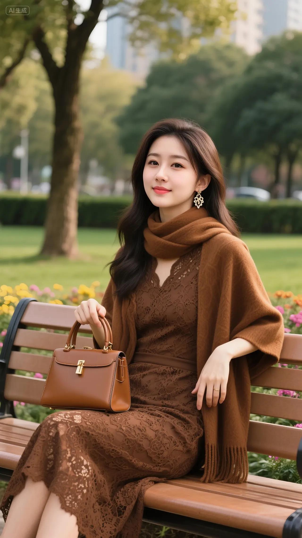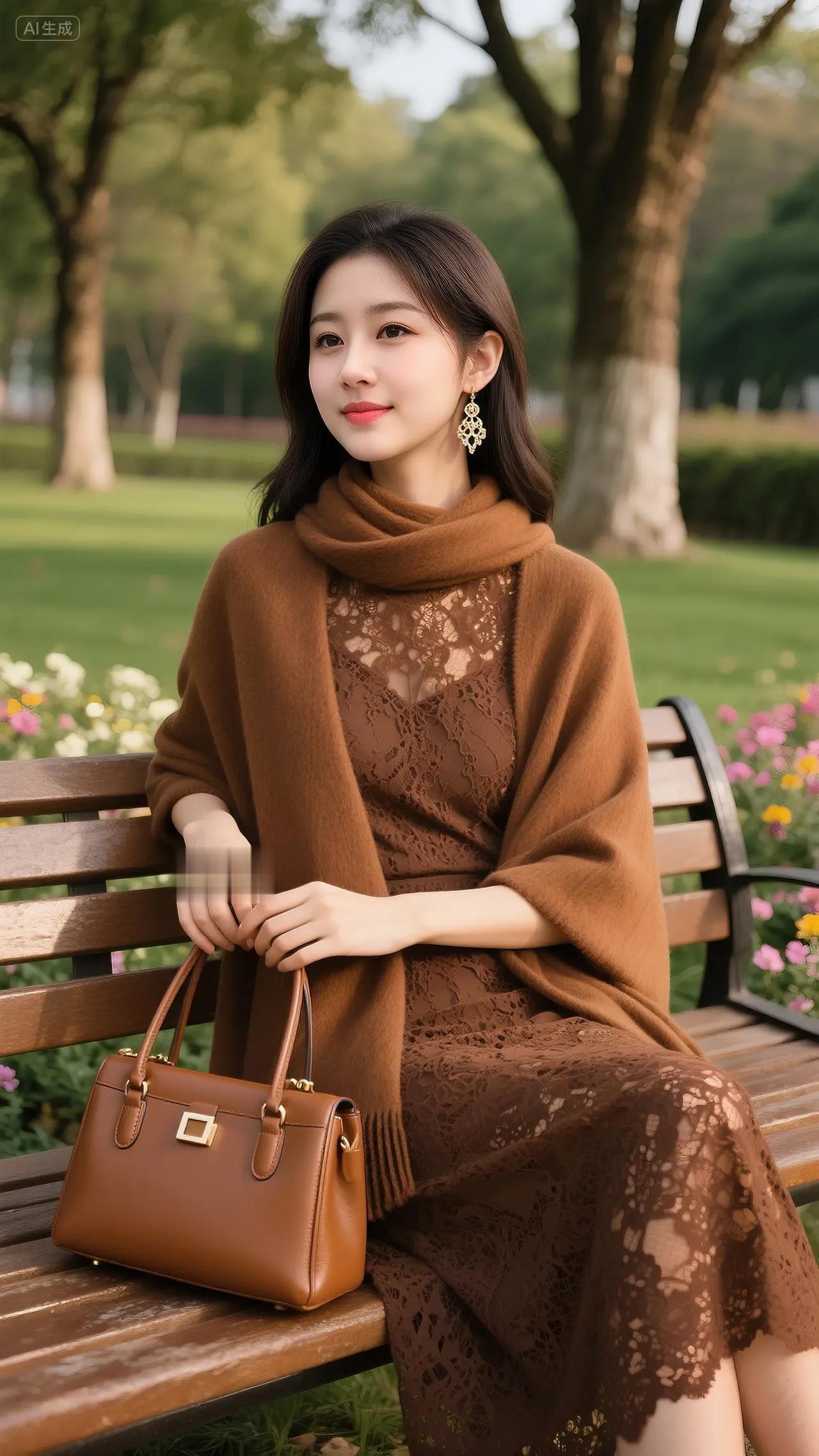 秋日公园里,美人倚长椅。