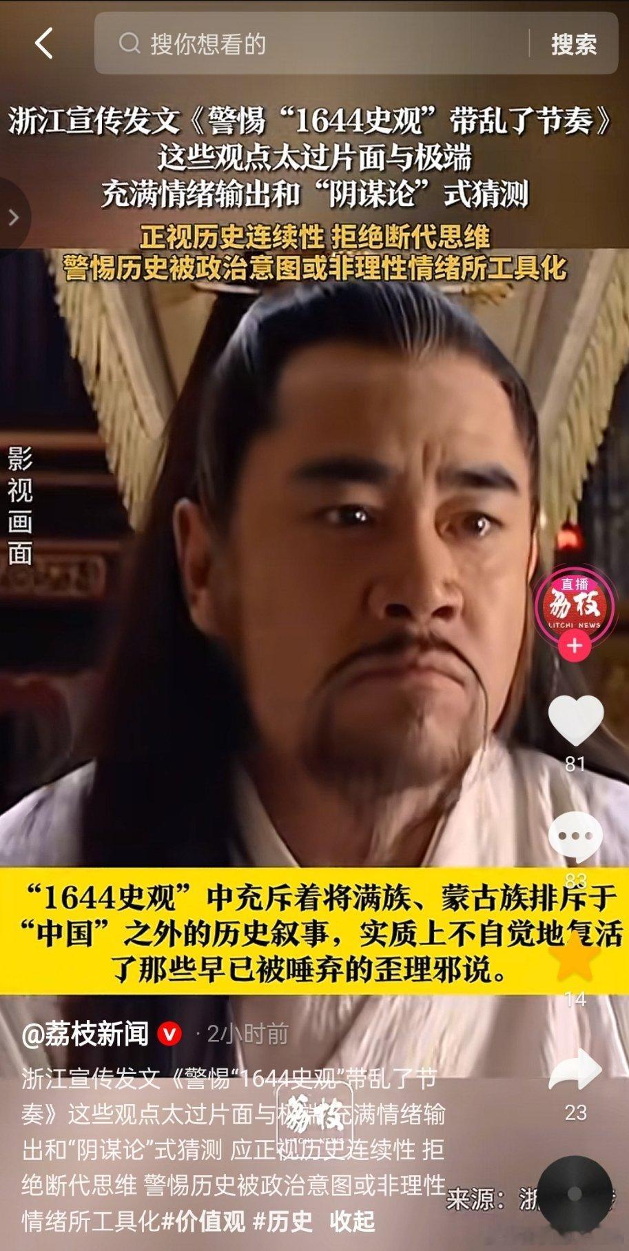 浙江宣传发文《警惕"1644史观"带乱了节奏》这些观点太过片面与极端。充满情绪输出和"阴谋论"式猜测。正视历史连续性,拒绝断代思维。警惕历史被政治意图或非理性情绪所工具化。警惕1644史观带乱了节奏