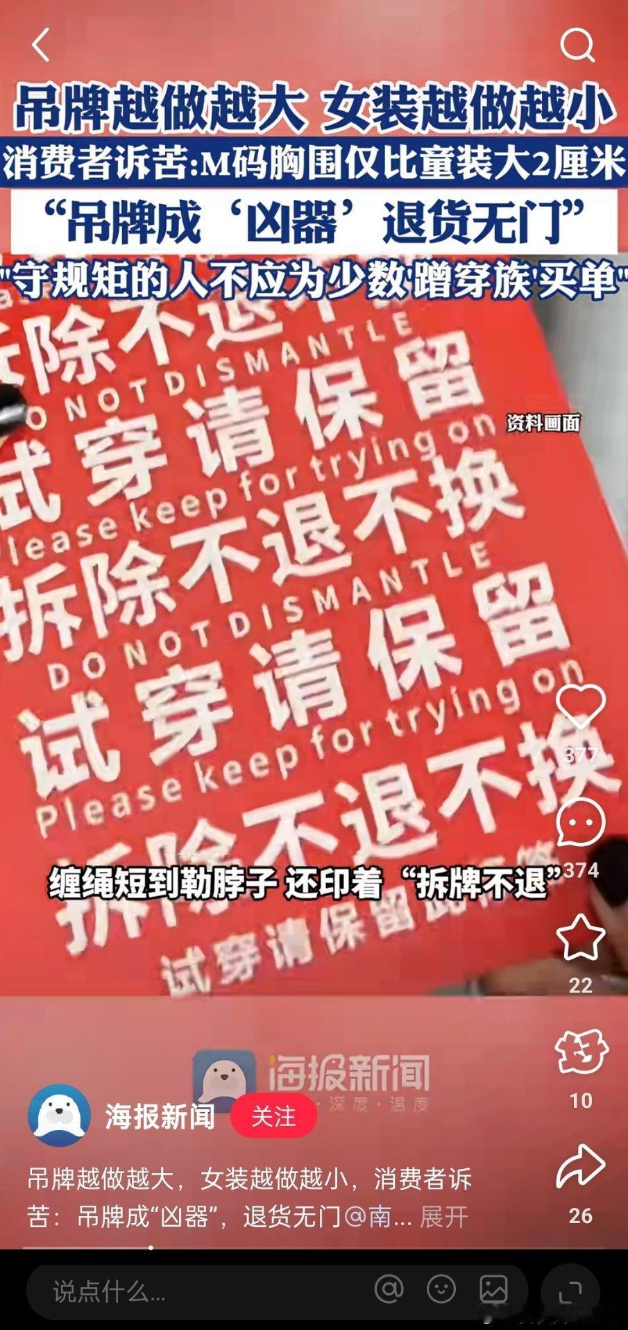 媒体:吊牌越做越大,女装越做越小,消费者诉苦:"吊牌成'凶器'退货无门"。"守规