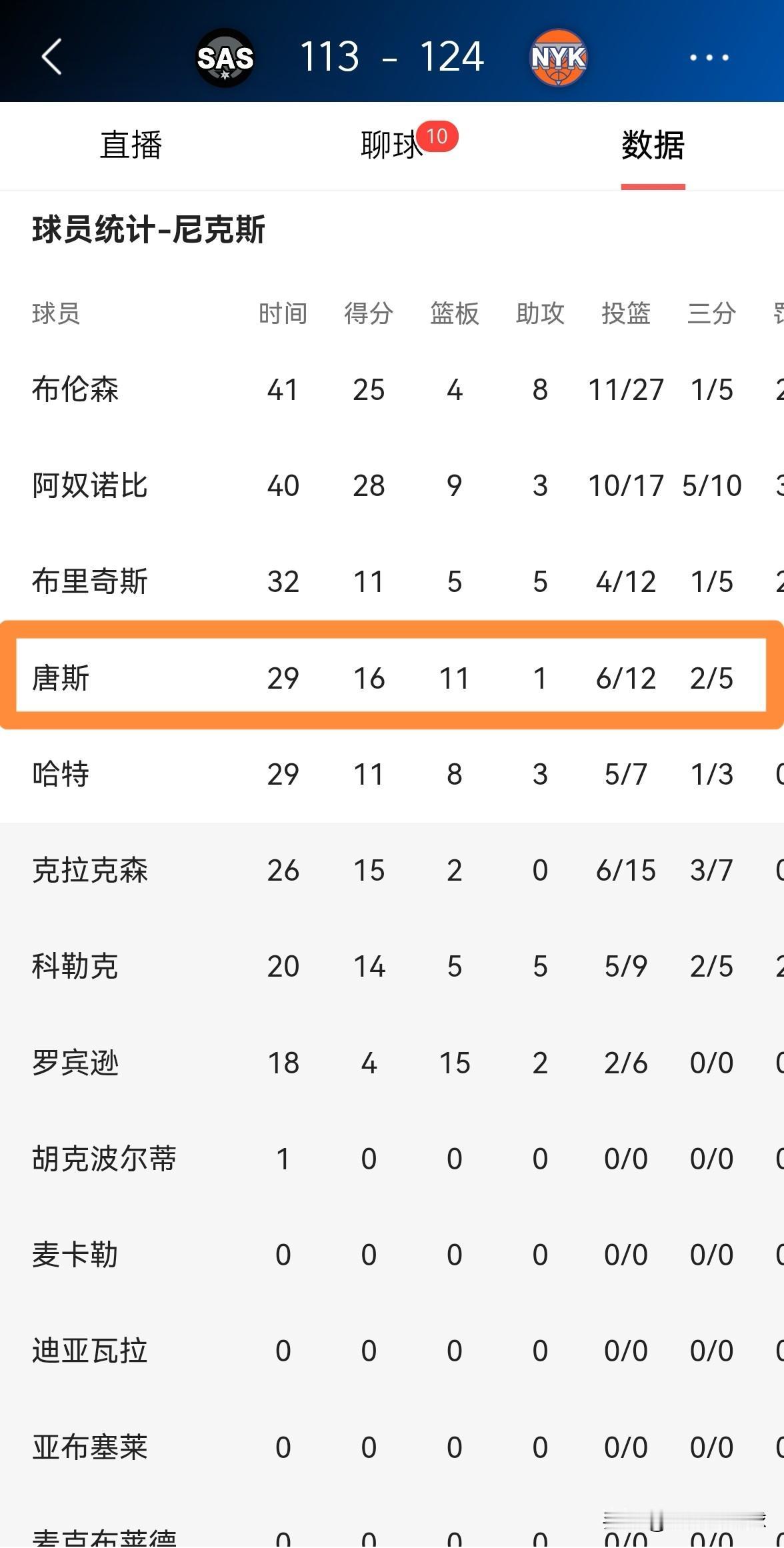 尼克斯当家中锋唐斯真是攻防俱佳!在今天尼克斯以124:113击败马刺的NBA杯决赛中,唐斯在攻防两端都打出了非常亮眼的表现。 全场比赛下来,唐斯首发出战29分钟,投篮12中6,其中三分球5中2、罚球2中2得到16分11篮板2抢断。 实事求是的说,以唐斯目前的能力来看,他绝对是当今NBA排名前五的中锋,目前实力在唐斯之上的中锋只有约基奇、申京、文班亚马和祖巴茨了。
