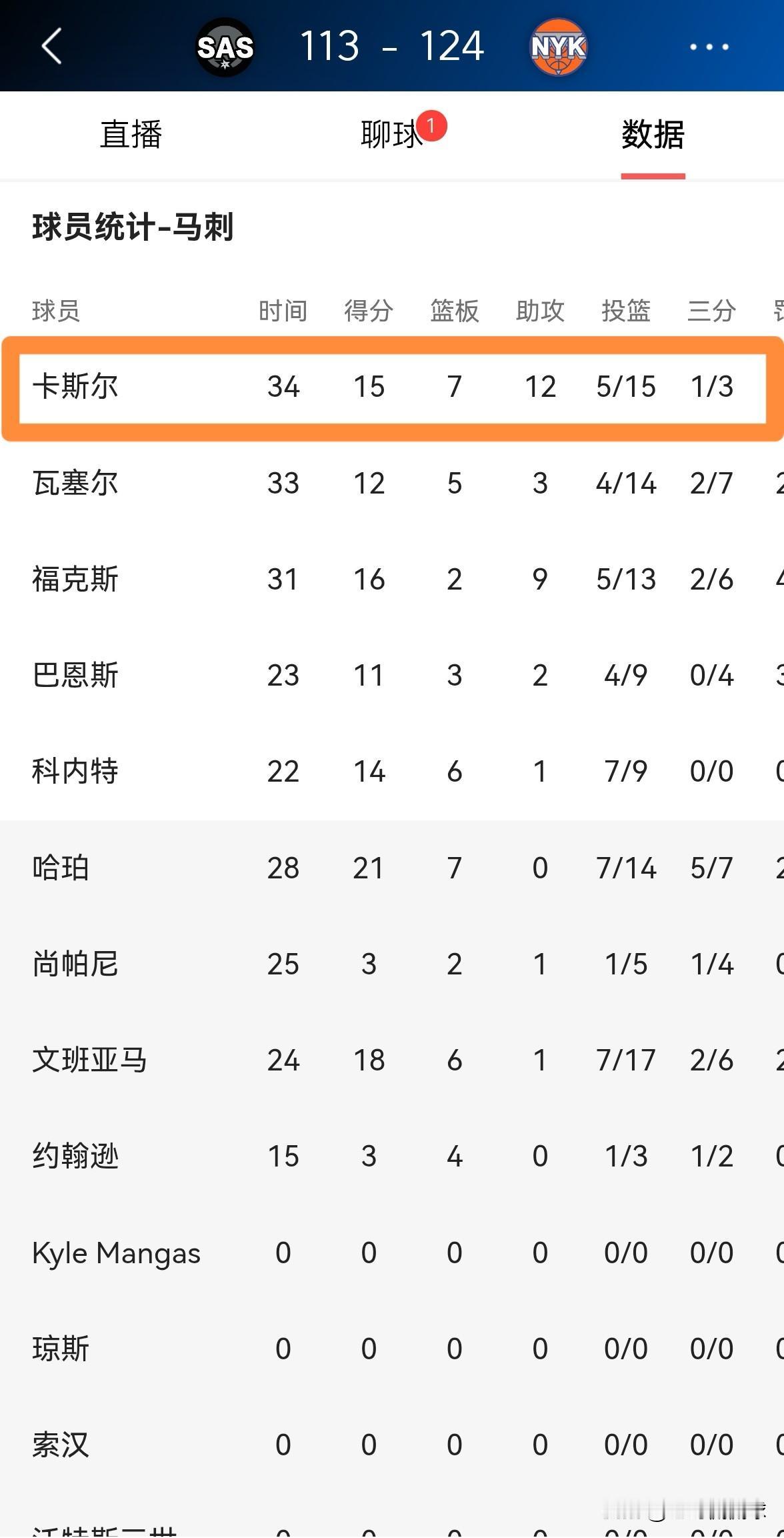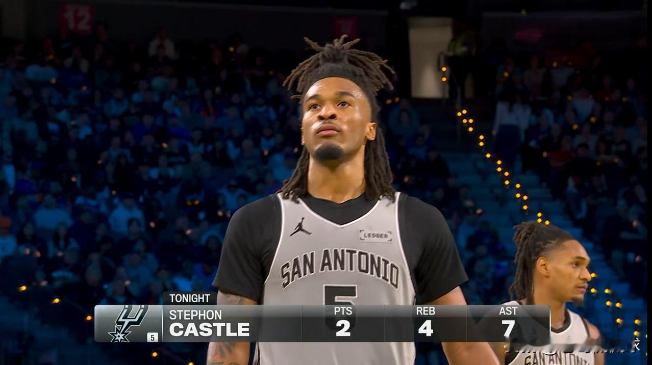 马刺新星卡斯尔的控场能力真是太强了!尽管今天马刺在NBA杯决赛中以113:124不敌尼克斯,但是卡斯尔在场上展现出了超强的控场能力。 全场比赛下来,卡斯尔首发出战34分钟,投篮15中5,其中三分球3中1、罚球5中4得到15分7篮板12助攻1盖帽,仅仅出现了2次失误。 实事求是的说,我在卡斯尔的身上看到了克里斯-保罗年轻时的身影,他们在场上都是出奇的冷静和稳定。