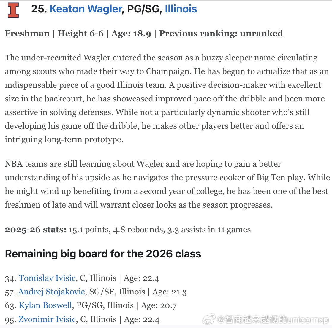 ESPN更新2026NBA选秀Top100排名,伊利诺伊大学的菜鸟后卫Keaton Wagler从上一期的未进Top100排名一口气杀到25位。上周场均21分7.5助获得Big10联盟周最佳菜鸟,进大学前全美高中生排名仅150位NCAANBA