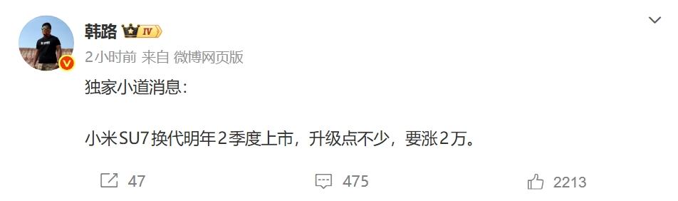 大老师的料曝得很精准:二季度上市、升级很多。 SU7在一个竞争相对激烈的级别里,能坚持两年,也算是能抗的了。 现在官网上看,标准版SU7的交付周期还要24-27周,基本上要半年,也就是说大概换代车型出来的时候才能提车。Pro和Max是7-10周。 那「换代车型」会不会就是之前曝光的「加长版」?【来自懂车帝车友圈】