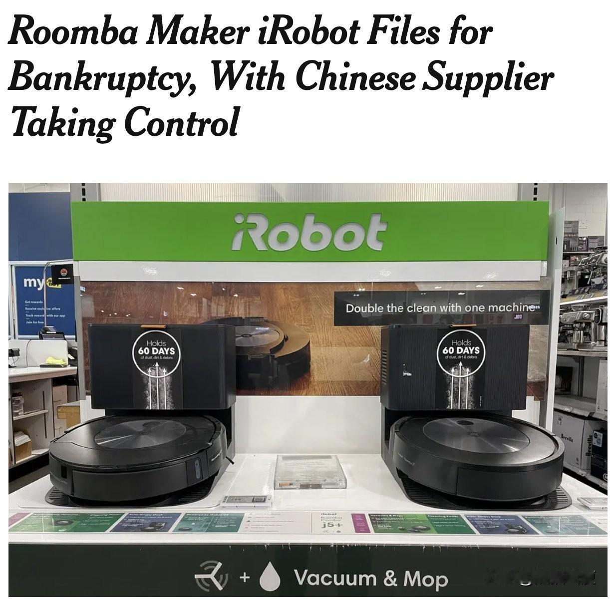 美国麻省理工在上世纪90年代创始的高科技公司iRobot,扫地机器人鼻祖,申请破产,引发美国科技业大讨论。 破产或许在美国司空见惯,但这家美国老牌企业,已经确认被自己远在深圳的代工制造商反向收购,而且是美国股东的权益全部清零。 这些笼中的金丝雀,非要跑到我们的煤矿里,是真没法活路。