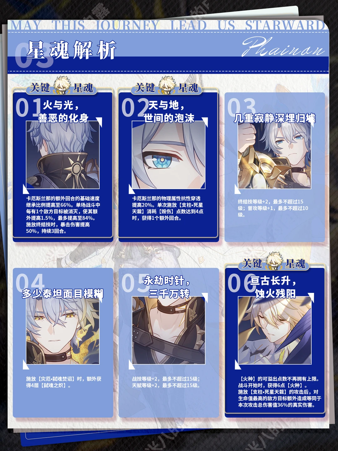 火与光,善恶的化身:卡厄斯兰那的额外回合的基础速度继承比例提高至66%。单场战斗中每有1个敌方目标被消灭,使其额外提高1.5%,最多提高至84%。施放终结技时,暴击伤害提高50%,持续3回合。