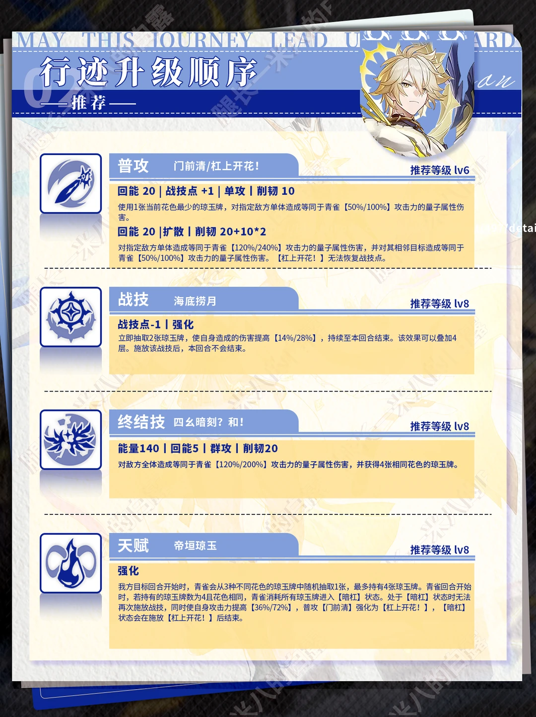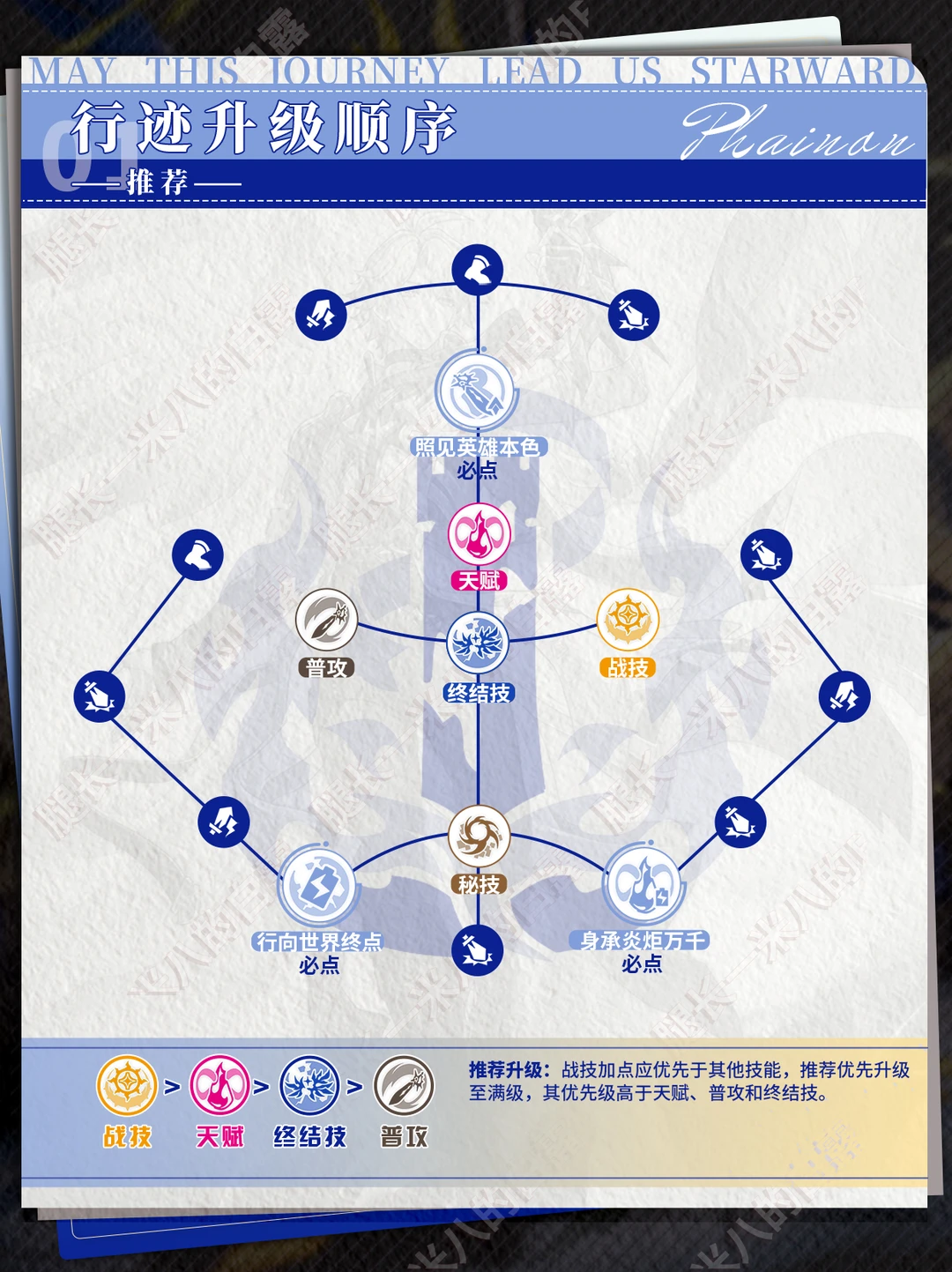 推荐升级:战技加点应优先于其他技能,推荐优先升级至满级,其优先级高于天赋、普攻和终结技。