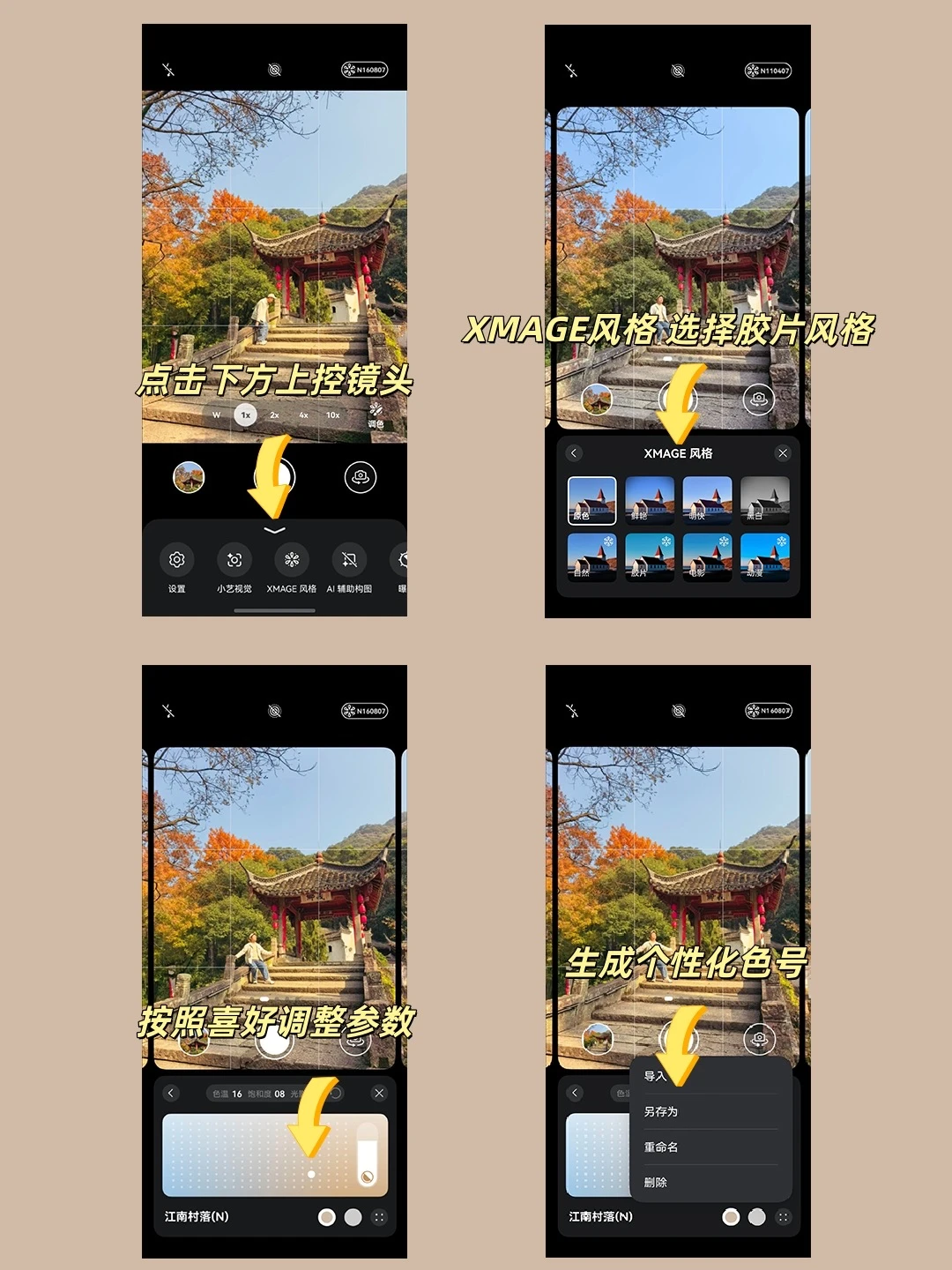 我特别调了一个专属 “电影C100505”色卡,带一点电影质感和时光晕染感,就像给照片加了层历史滤镜,瞬间拍出梁思成考察笔记里的质感!