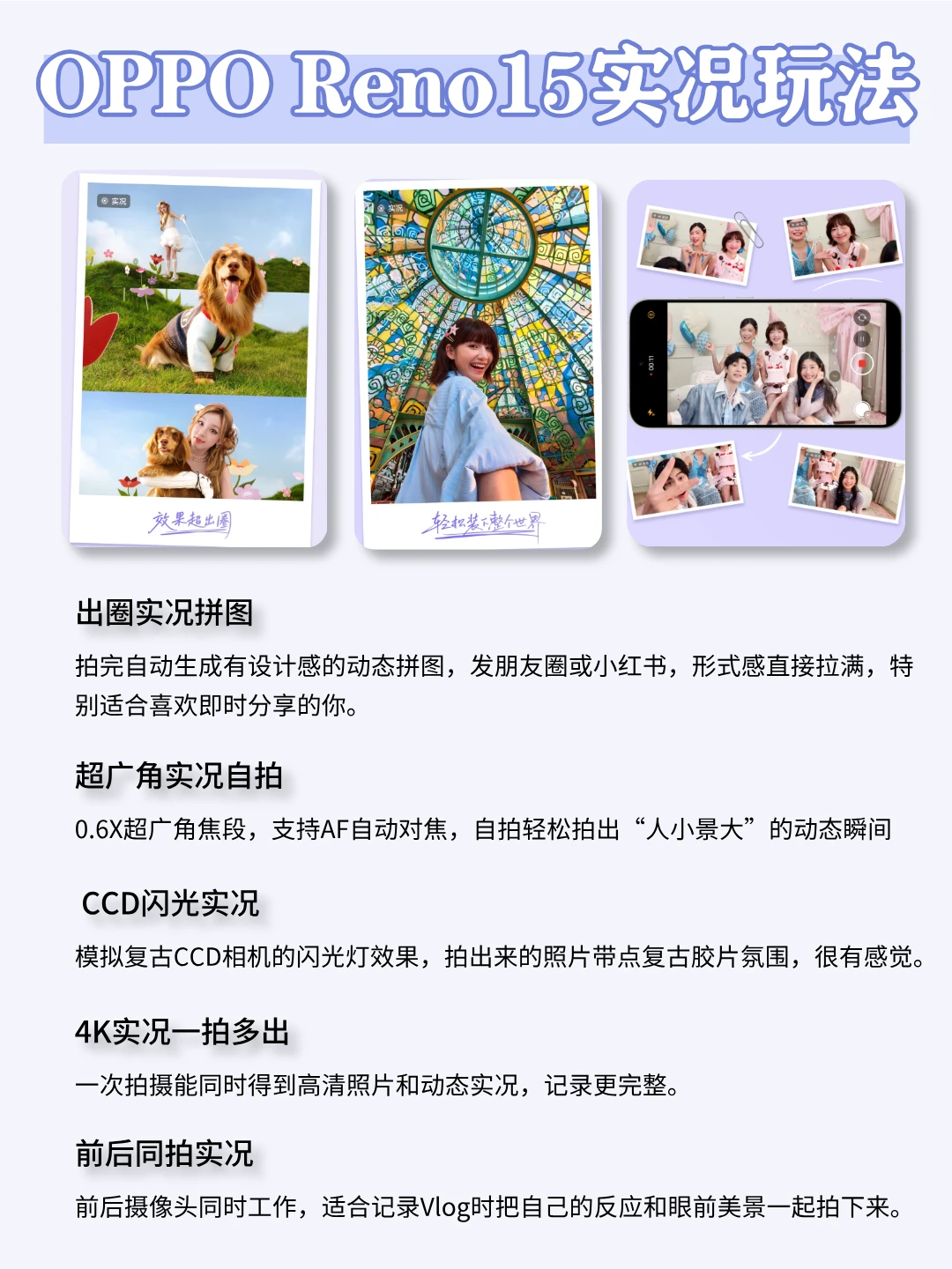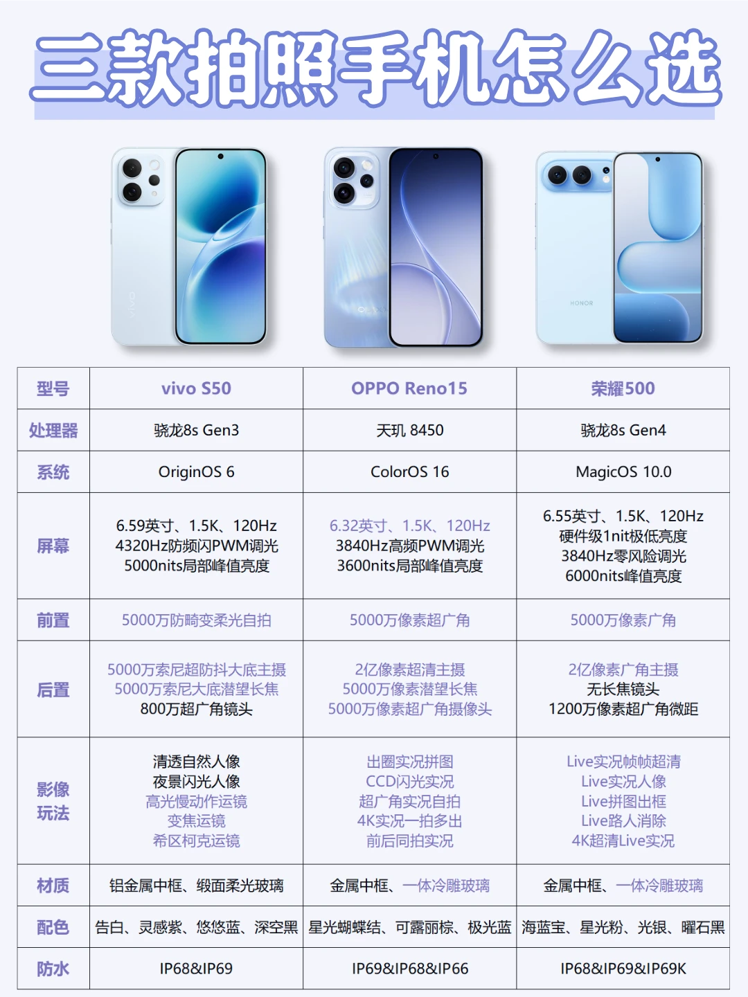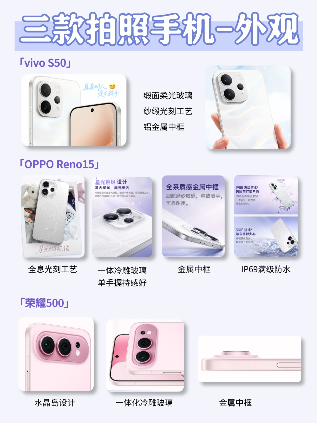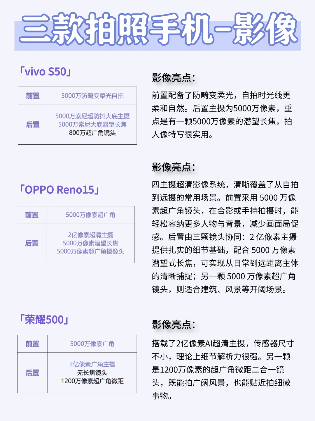 [自拍R]选拍照手机不用太纠结,其实 OPPO Reno15、vivo S50 和荣耀500 在影像上各有侧重,搞清楚你更看重什么,就很好选。[斜眼R] 📸 OPPO Reno15:主打“实况出圈”,分享更省心 后置三颗镜头很均衡:2亿主摄 + 5000万潜望长焦 + 5000万超广角,远近都能清晰捕捉。前置5000万超广角,合照时能轻松框下更多人。 它的核心玩法围绕 “实况” 和 “出圈”: ・出圈实况拼图:拍完自动生成动态拼图,直接发或朋友圈,形式感拉满。 ・CCD闪光实况:模拟复古相机闪光效果,照片带点胶片氛围。 ・前后同录:前后镜头可同时工作,适合记录vlog时同步自己的反应和眼前画面。 [星R]如果你喜欢随手记录、即时分享,追求拍照的趣味和社交效率,Reno15 这套组合会很顺手。 🌼 vivo S50:侧重“人像质感”与“视频运镜” 前置配备防畸变柔光,自拍光线自然。后置搭载5000万潜望长焦,适合人像特写,并配有影棚级柔光环,暗光补光更柔和。 它的强项在于人像优化与视频创作: ・清透自然人像:美化偏向自然肤色与肌理,避免过度磨皮。 ・电影运镜模板:内置希区柯克变焦等模式,新手也能拍出有电影感的短片。 ・氛围胶片滤镜:直出色彩带有胶片质感。 [星R]适合爱自拍、爱拍短视频,希望照片和视频都带些专业感的用户。 🔅荣耀500:强调“高清画质”与“实用功能” 搭载2亿像素AI超清主摄,细节解析力强,另配一颗1200万像素超广角微距二合一镜头,兼顾广阔画面与细微特写。 功能围绕高清晰度与场景实用: ・Live实况清晰:动态照片每帧都保持较高清晰度。 ・Live路人消除:实用功能,可智能去除照片中的杂乱路人。 ・4K超清实况:支持高画质动态照片记录。 [星R]适合对画质细节要求高、需要应对旅行打卡等复杂场景的实用派。 [派对R]像我自己最近用 Reno15 比较多,主要是因为它从拍到发的流程特别顺,实况拼图直出发社交平台真的省时间,而且ColorOS 16系统使用也很流畅,日常体验感不错。[喝奶茶R]大家可以参考看看~