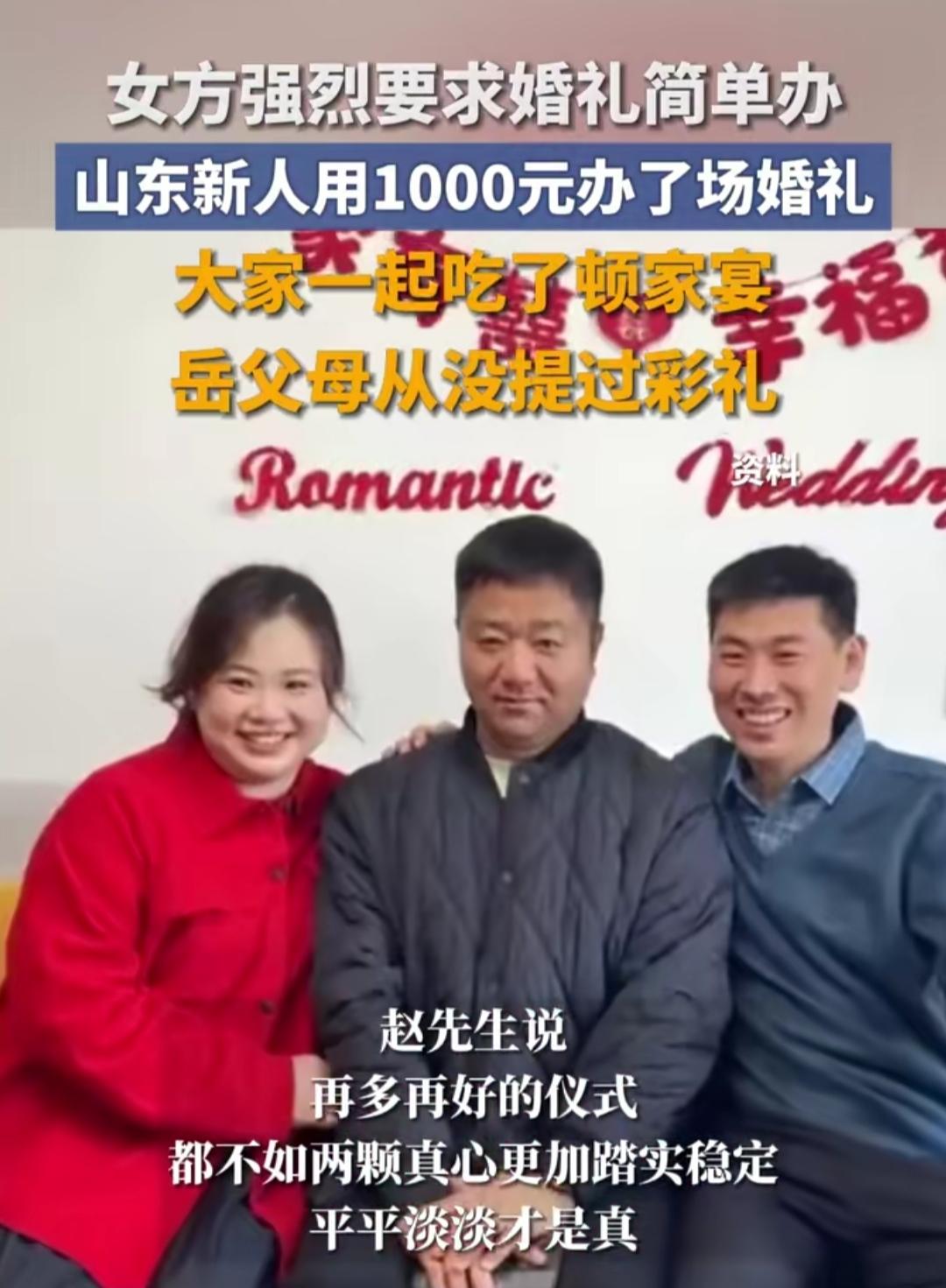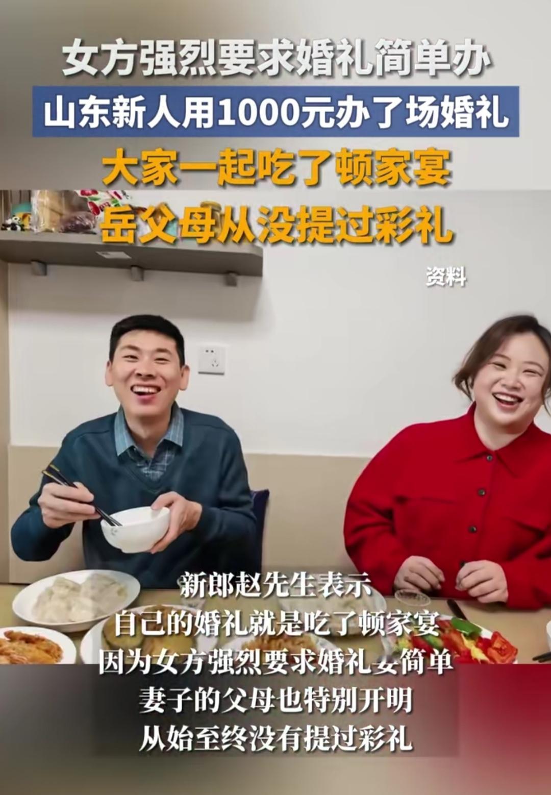 结婚花1000块钱够不够?山东这对新人给出了答案!没有豪华车队、没有大排宴席,甚至没请婚庆公司,一场极简婚礼却让全网羡慕到刷屏。 两人是普通上班族,筹备婚礼时达成共识:婚姻的核心从不是场面大小,而是往后的柴米油盐里彼此珍惜。1000块预算里,300块买了简约婚纱和西装,200块定制了手写请柬,剩下的钱全花在食材上——邀请双方父母和至亲,在家做了一桌家常菜。 新人说:“比起借钱办一场撑面子的婚礼,我们更想把钱留着装修小家、规划未来。”没有复杂流程,没有煽情话术,简单的仪式里全是真诚。 其实婚姻的本质从不是排场,而是两个人愿意为彼此踏实过日子。那些被吐槽“寒酸”的背后,藏着最清醒的幸福观:不被世俗绑架,不盲目攀比,把日子过在自己心里,比什么都重要。你认同这样的极简婚礼吗?