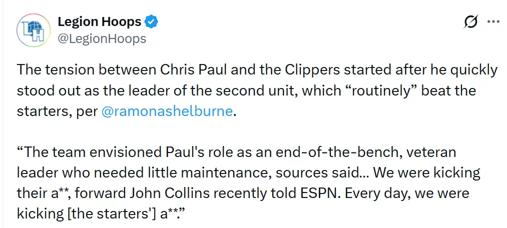 美媒:保罗经常带领替补击败首发,这使快船与保罗关系紧张今日,美媒LegionHoops发文,称保罗迅速成为第二阵容的领袖并且经常带领替补击败首发,这使快船与保罗关系紧张。正文:消息人士称,“球队设想保罗的角色是替补席末端的老将领袖,不需要太多照顾。”前锋科林斯最近告诉ESPN:“我们把他们打得落花流水,我们每天都把(首发)打得落花流水。”保罗一段时间之前被快船通知离队,目前暂未加入任何球队。NBA