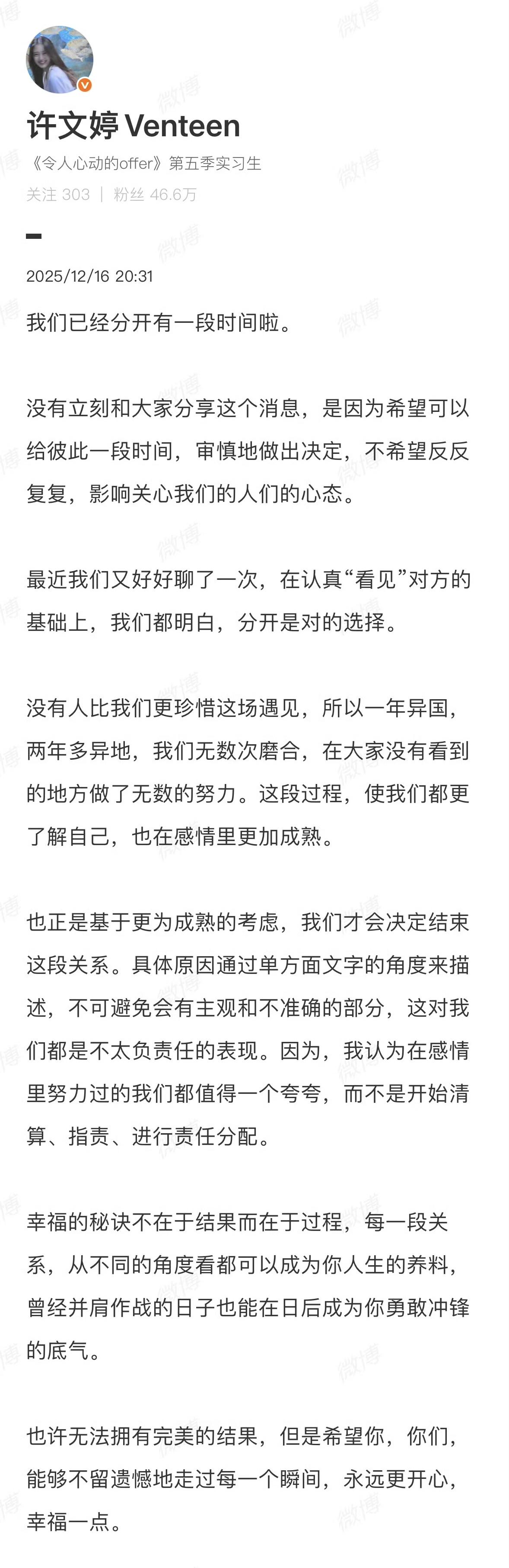 “人文CP”毛人龙和许文婷官宣分手 又一对恋综CP走向BE了 印象中两位都是很温柔的人 就连分手博也写的很温柔 希望未来两位可以更好!