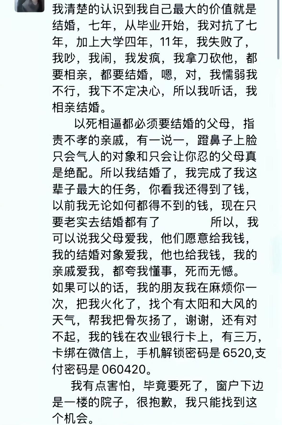 28岁女教师结婚当天坠亡 朋友圈遗言字字泣血 为什么这个社会 竟然到现在还不能接受 有些女性的生命里 是可以没有婚姻甚至没有爱情的!