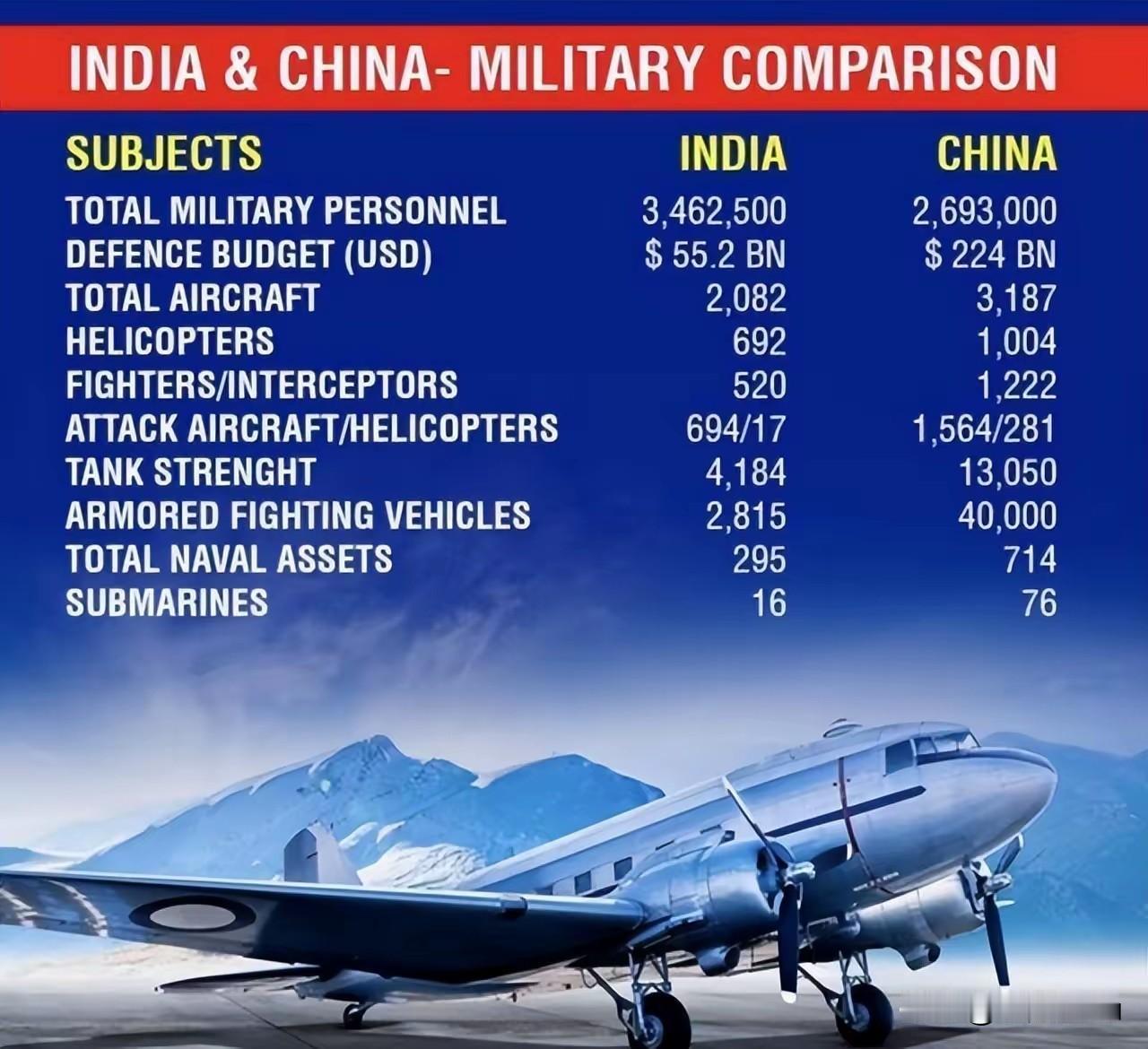 假如中印开战谁能赢?印网友 结论很奇葩 印度网友觉得地理因素能赢中国,但2025年数据显示中国军力、高原基建、工业经济占优,胜算更高,且中印经济依赖,不会轻易开战。 SUBJECTS TOTAL MILITARY PERSONNEL DEFENCE BUDGET (USD TOTAL AIRGRAFI HELIGOPTERS FIGHTERS/INTERCEPTORS ATTACK AIRCRAFT/HELICOPTERS TANK STRENGH ARMORED FIGHTING VEHICLES TOTAL NAVAL ASSETS SUBMARINES INDIA 3, 462, 500 $ 55.2 BN 2.082 694/1