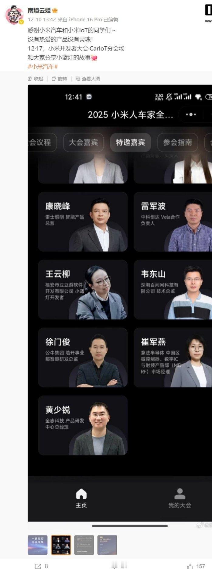 【小米 SU7/YU7 迎来第三方开发的辅助智驾小蓝灯,2027 年开放车载中枢网关】2025 小米“人车家全生态”合作伙伴大会上,小米汽车部人车家智能化产品总监陈君宇谈到了 CarIoT 生态开放进展。小米 CarIoT 生态今年已开放家控车,明年将开放车控家;2027 年将迎来车载中枢网关,实现车载生态设备全连接。IT之家从大会获悉,得益于生态开放,陈君宇宣布小米 SU7/YU7 系列迎来辅助智驾小蓝灯配件,这个小蓝灯由第三方开发。 在今年 9 月展示了该配件的测试视频,表示该配件由博主 SU7 和 YU7 都能装,支持连入车机,正式有品众筹时间在 1 月。查询发现,2025 小米“人车家全生态”合作伙伴大会官网显示,小蓝灯开发者是福安市豆豆游软件开发有限公司的开发者王云柳。据介绍,小米 CarIoT 生态已开放,包括生态硬件接口、车载生态件产品、车家互联、智能互联生态联盟。