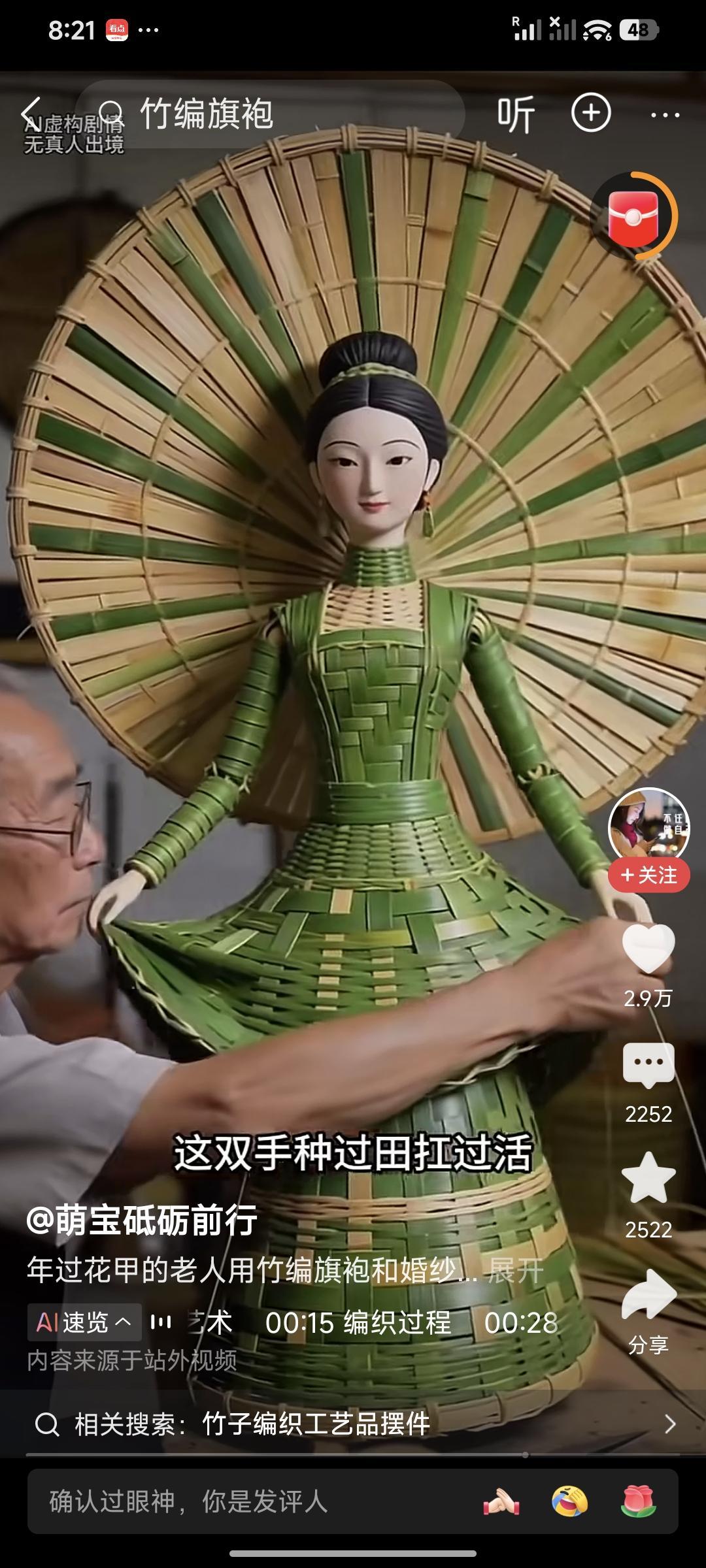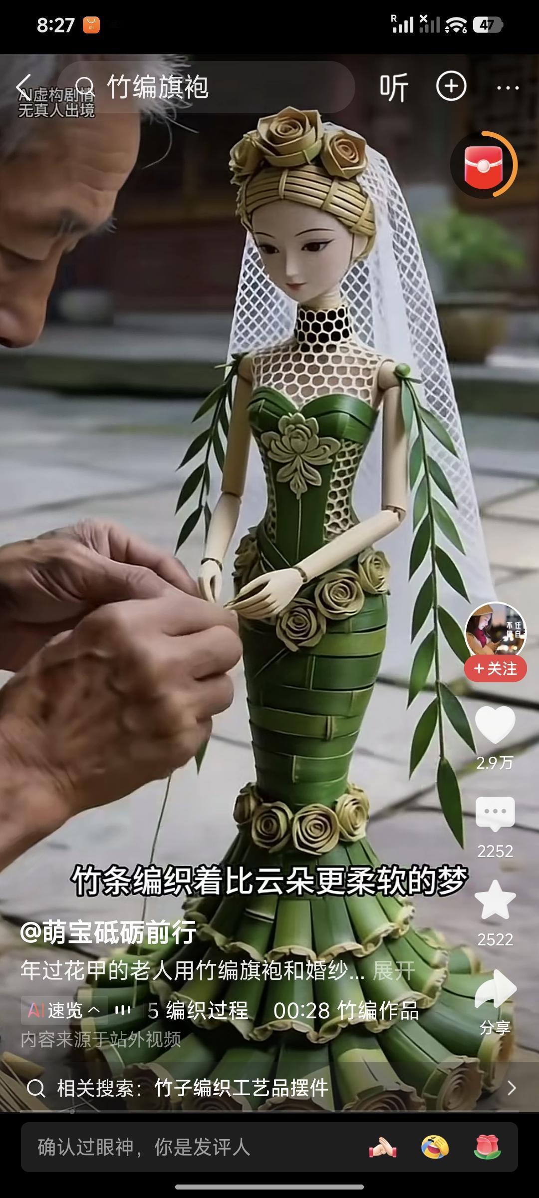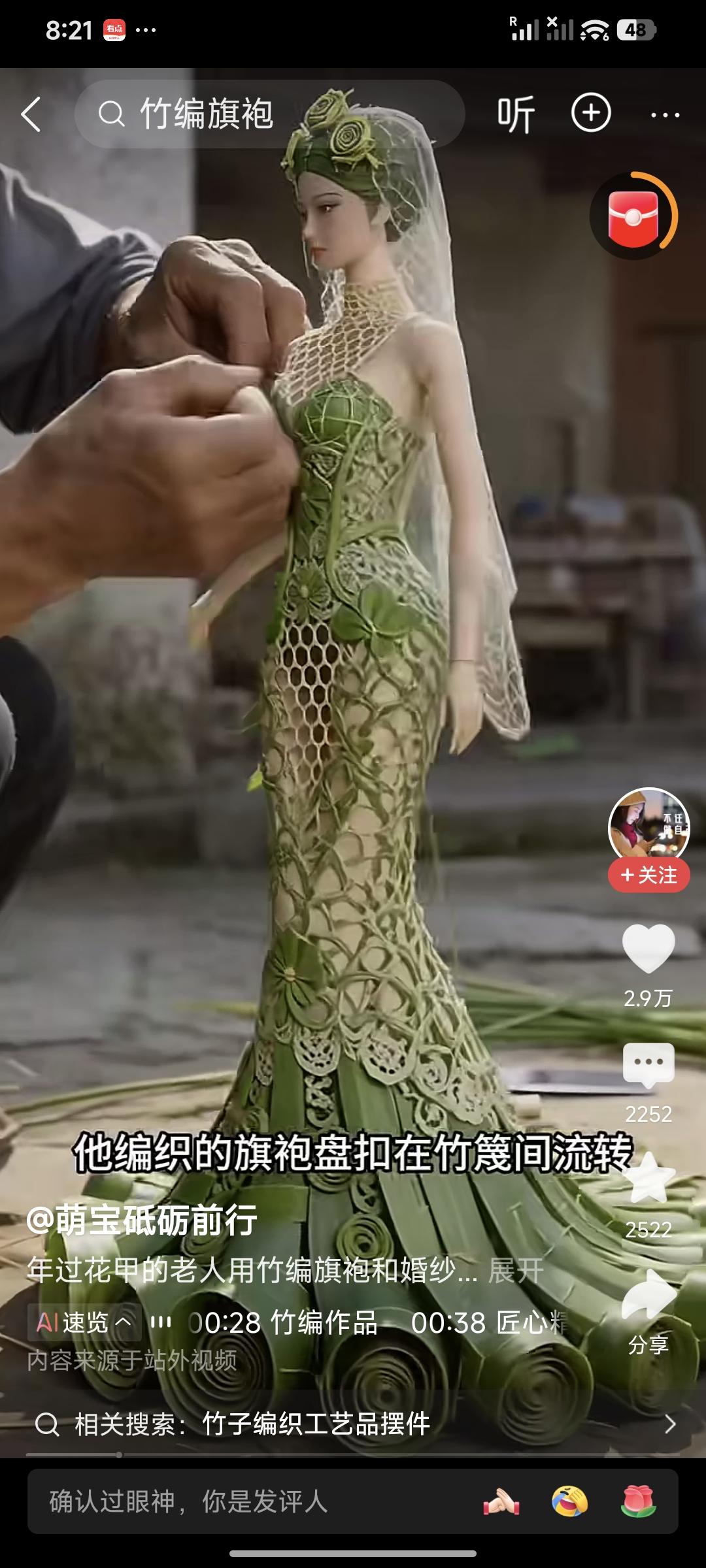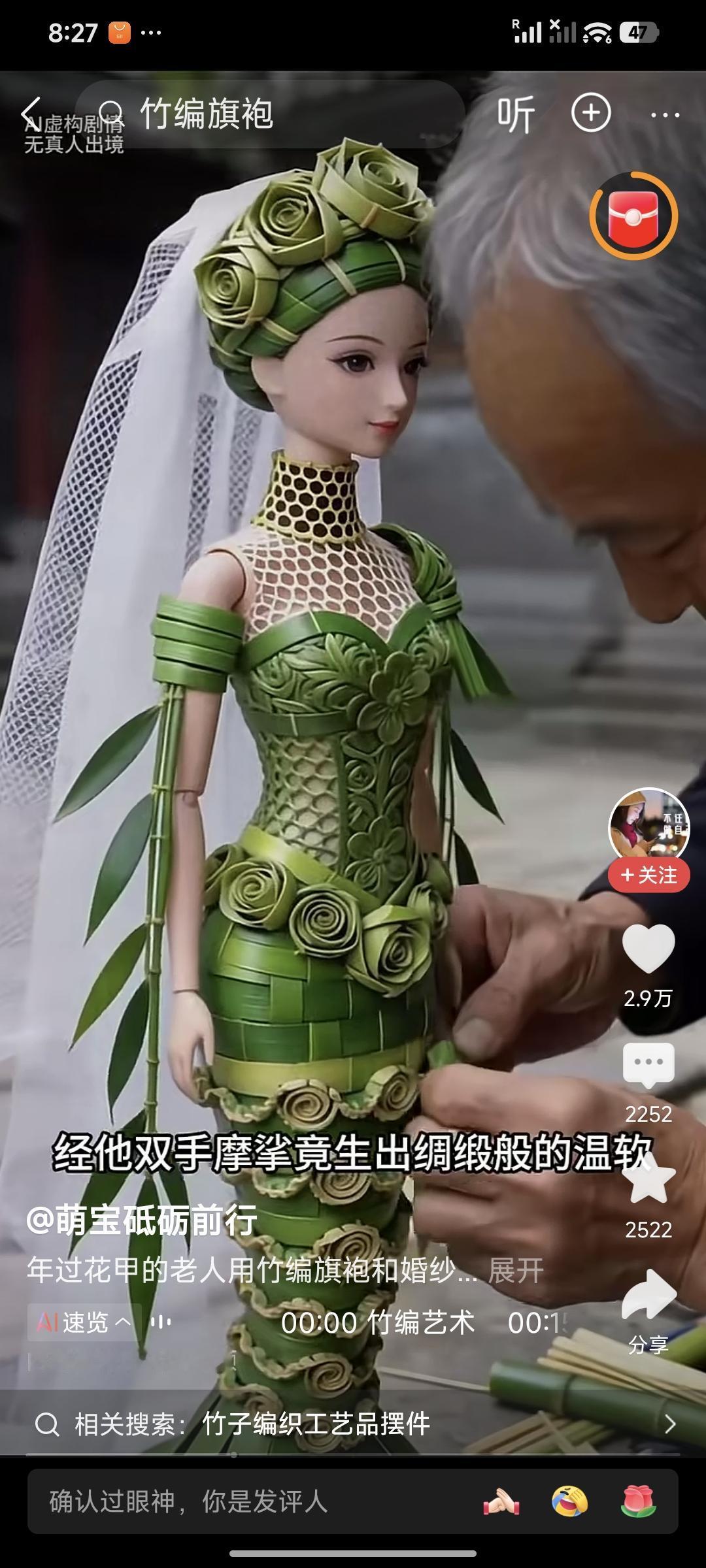 这样的人算不算艺术大师? 刚刚看到一个视频,介绍的是一位年过六旬的民间艺人,用竹子编出来了各种竹子美女,令人大开眼界…… 竹子,在一般人的眼里,就是一根根绿色的植物,除了是熊猫的食材外,也就是个建筑材料和各种竹艺原料,可在这位民间艺人的手里,它居然变成了一个个漂亮的窈窕淑女…… 看完视频,令我惊愕,他不光是竹艺精湛这么简单,他的美女服装设计应该超过了某些服装设计师…… 我就想问,这样的人是不是艺术大师?