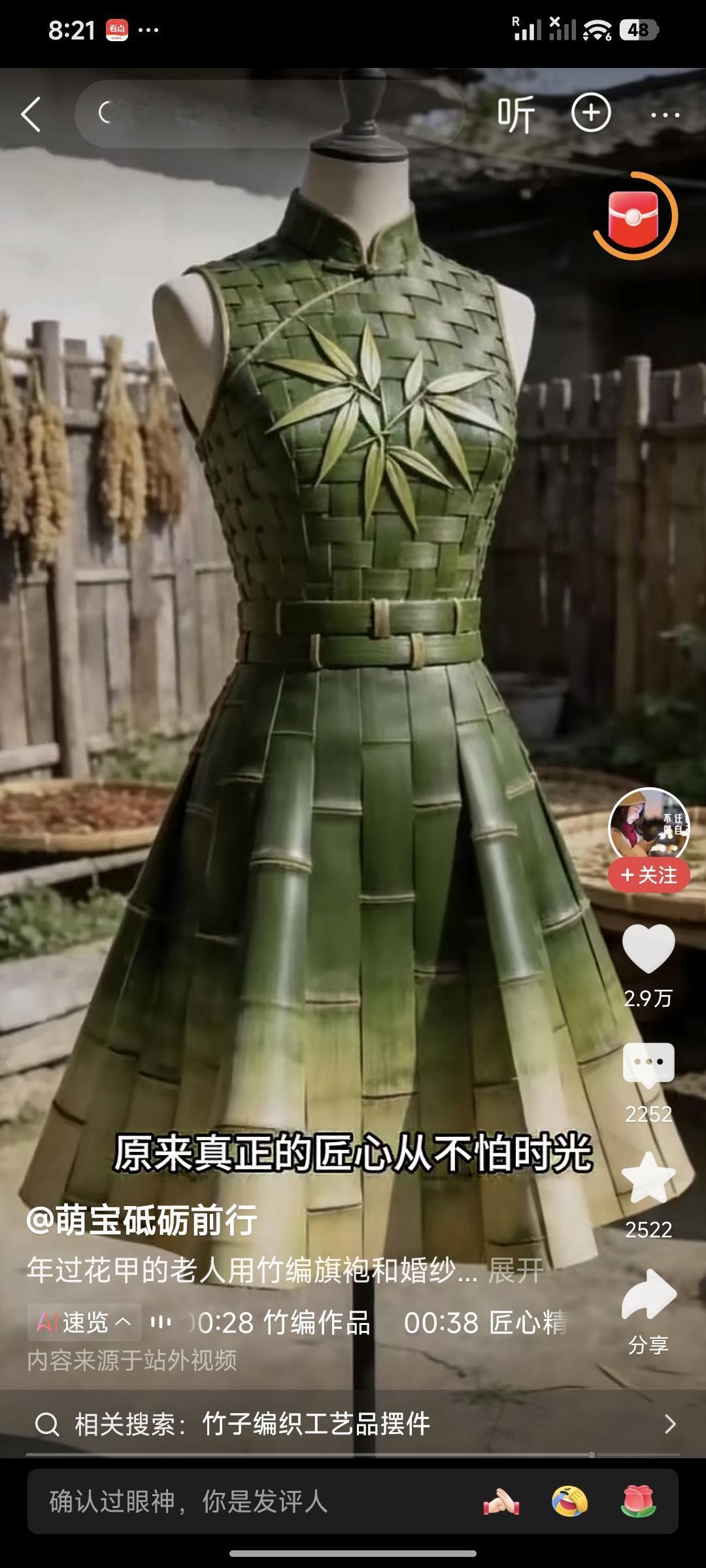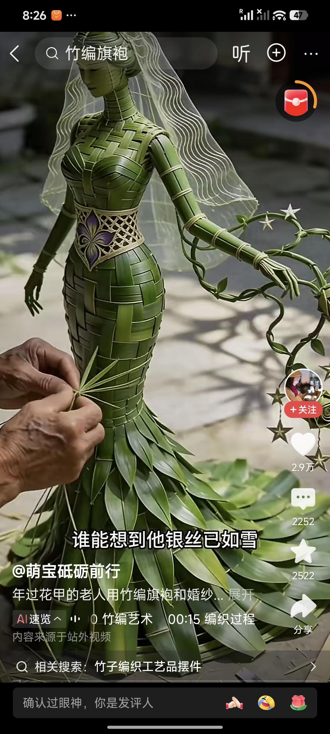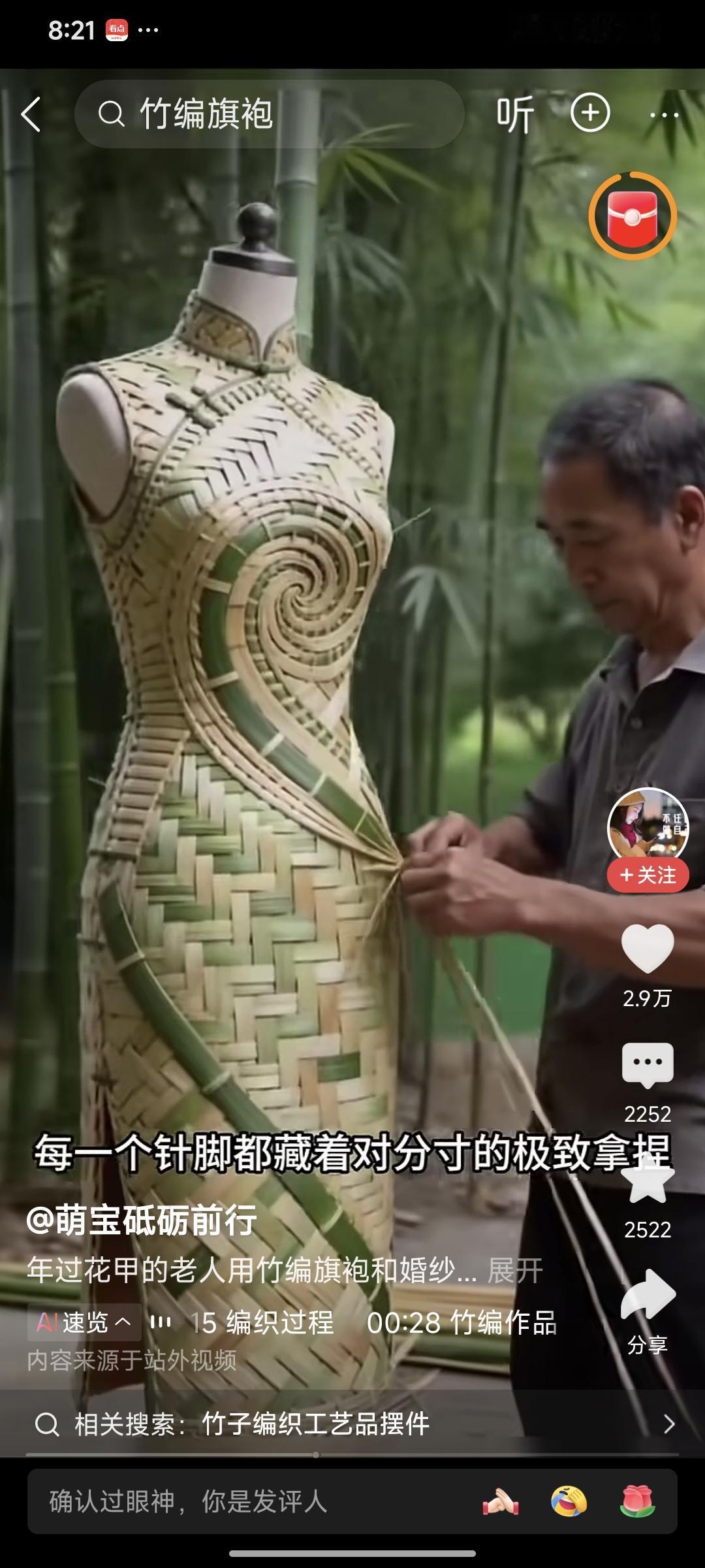 这样的人算不算艺术大师? 刚刚看到一个视频,介绍的是一位年过六旬的民间艺人,用竹子编出来了各种竹子美女,令人大开眼界…… 竹子,在一般人的眼里,就是一根根绿色的植物,除了是熊猫的食材外,也就是个建筑材料和各种竹艺原料,可在这位民间艺人的手里,它居然变成了一个个漂亮的窈窕淑女…… 看完视频,令我惊愕,他不光是竹艺精湛这么简单,他的美女服装设计应该超过了某些服装设计师…… 我就想问,这样的人是不是艺术大师?