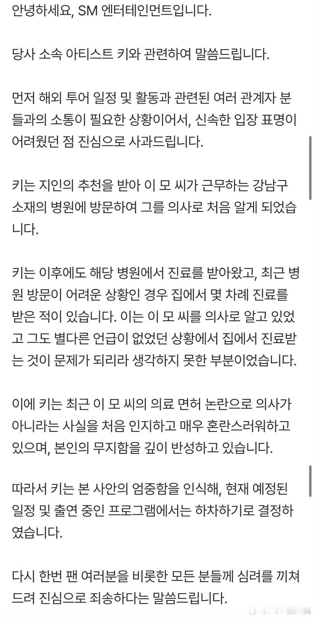 Key宣布中断活动,下车所有节目以下是SM发表的官方立场:首先,由于需要就海外巡演行程及相关活动与多方相关人士进行沟通,未能第一时间表明立场,对此我们深表歉意。Key 经由熟人推荐,前往一所位于首尔江南区、由李某任职的医院就诊,并最初将其认识为医生。此后,Key 也持续在该医院接受诊疗;在近期因不便前往医院的情况下,也曾在家中接受过数次诊疗。由于 Key 一直将李某视为医生,且对方也未作任何特别说明,因此未意识到在家中接受诊疗可能存在问题。近日,随着有关李某医疗执照的争议出现,Key 才首次得知对方并非医生一事,对此感到非常混乱,并对自身的无知深刻反省。因此,Key 已充分认识到本事件的严重性,并决定退出目前已确定的行程以及正在出演的相关节目。再次就此次事件给粉丝以及所有关心此事的人士带来的困扰,致以诚挚的歉意。
