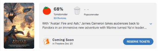 《阿凡达3》口碑已开!烂番茄新鲜度68%,均分6.4!不及第一部《阿凡达》81%新鲜度、7.8均分以及《阿凡达2》76%新鲜度、7.1均分。MetaCritic开分64,不及第一部的83及前作《阿凡达2》的67分。口碑优缺点都非常明显,放低期待,或许还能有惊喜。