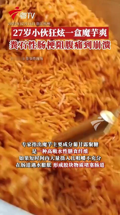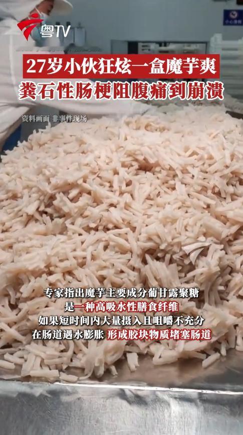 “悲剧还是发生了!”近日,浙江杭州,一男子加班时,感觉有些饿,刚好冰箱里有一大盒“魔芋爽”,他便拿出来全吃了,第二天,男子突然胃痛,坚持到晚上,已经痛得连觉都睡不着了!去医院检查,被诊断为粪石性肠梗阻。网友:嘴馋惹得祸! 不知道大家有没有吃过魔芋爽,嚼起来脆脆的,再搭配上辣椒入味,很容易让人吃上头,吃过一次就流连忘返,不过这种零食一次性也不能吃太多,不然会伤害身体。 据媒体12月16日的报道,前不久,男子工作时,同事给大家分发了魔芋爽,这是男子第一次品尝这种零食,并且瞬间就爱上了这种味道! 一天晚上,男子在公司里加班,由于有些饿了,他就去冰箱里找东西吃,意外看到了同事的魔芋爽,打过招呼后,他便将一大盒全都给吃了。 可第二天起床后,男子却感觉胃部隐隐作痛,本以为是胃病犯了,他就吃了些胃药,可到了晚上,已经疼得他无法睡觉了,于是急忙去医院检查。 医生发现,男子的肠道被一块“粪石”卡住,消化系统因此受阻,所以才不舒服的,而罪魁祸首正是魔芋爽! 原来,魔芋吸水后会大量膨胀,男子一次性吃了这么多,有的没有咀嚼充分,所以无法被消化吸收,最终就卡在了肠子里。幸好并没有完全把肠道堵住,经过医生的治疗,已经被排出来了。 这件事提醒我们,不管再好吃的东西,都不能一次性吃太多,只有管好自己的嘴,才能保证身体健康,毕竟很多病都是被吃出来的! 信息来源:《“第一次吃 没想到把自己吃进医院” 27岁小伙一口气炫完一大盒魔芋爽 半夜痛醒 被确诊肠梗阻 有块“粪石”卡在肠道》南方都市报