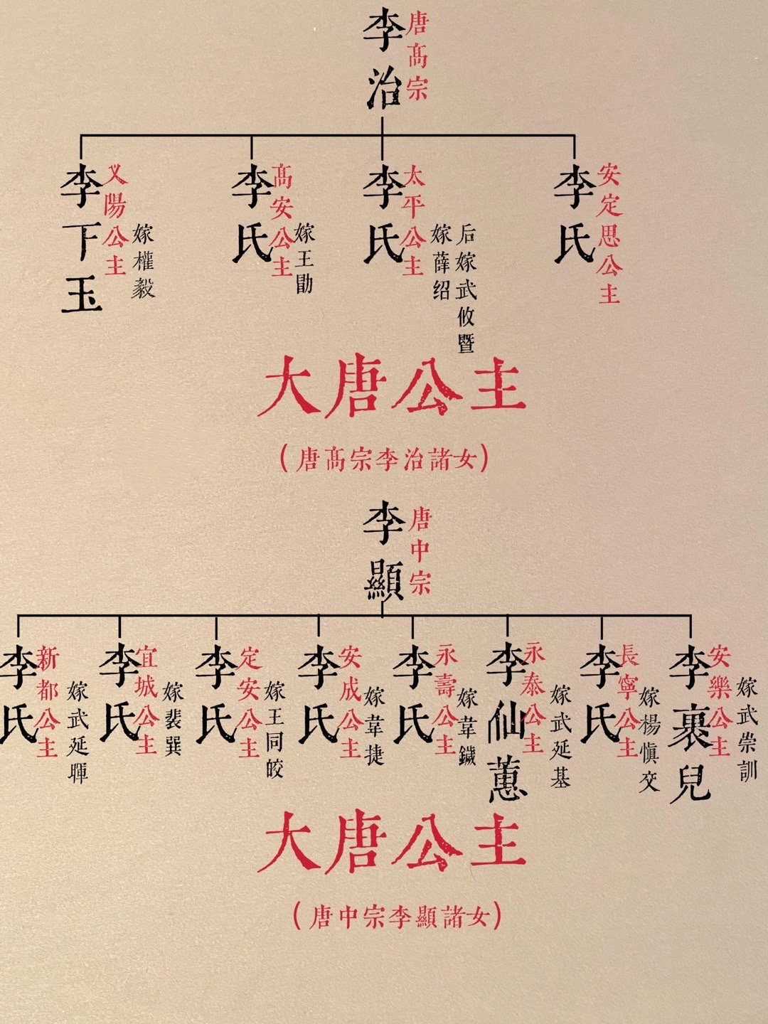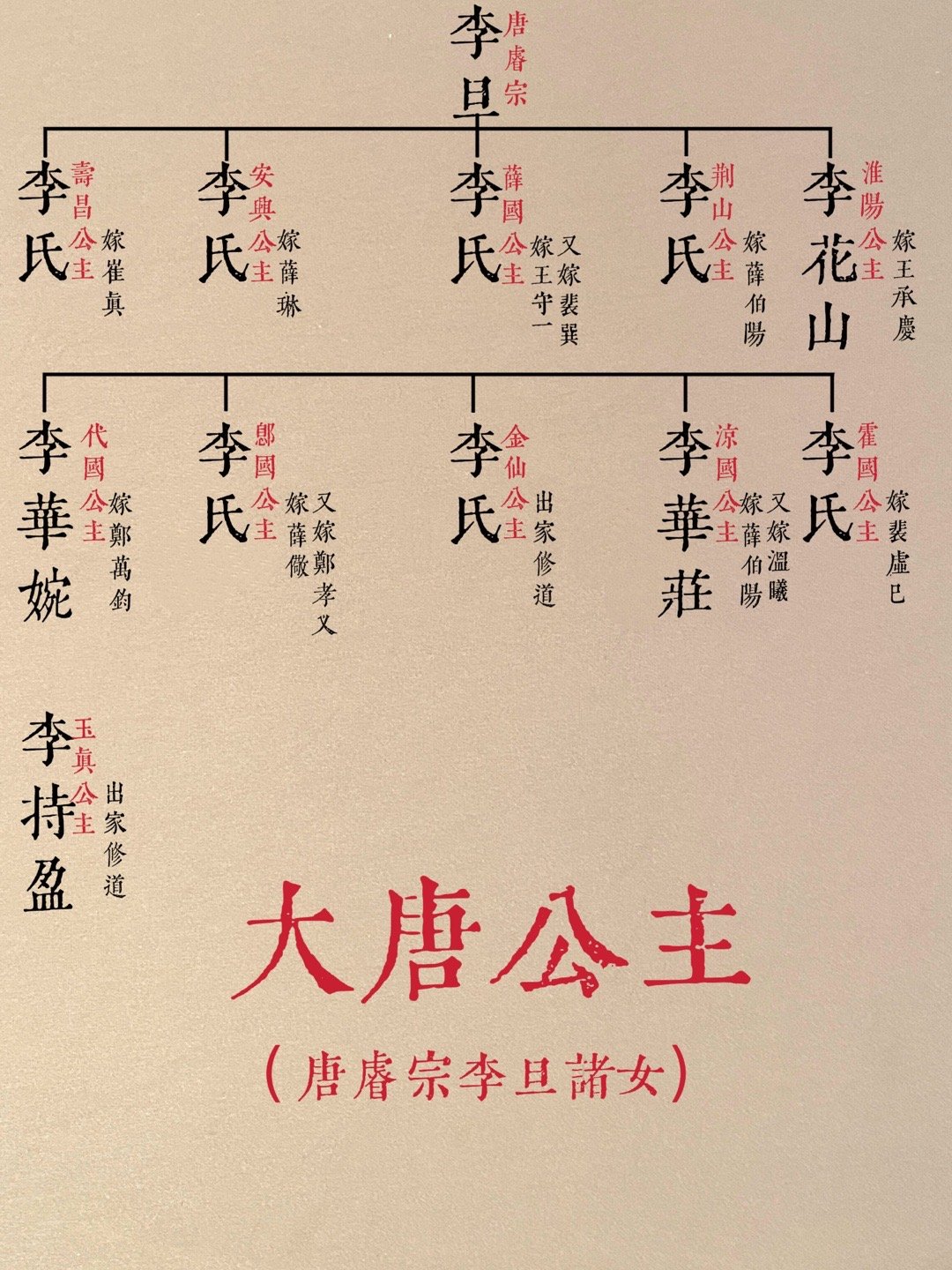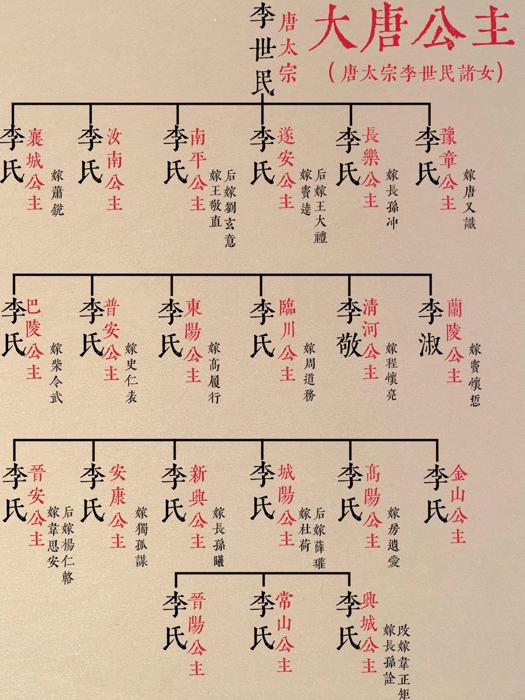 天之骄女 | 大唐的公主们👸🏻平阳公主,陇西狄道人,唐高祖李渊第三女,母为太穆皇后窦氏。才识胆略过人,早年嫁给千牛备身柴绍。大业末年,为了策应晋阳起兵,聚拢关中豪杰,发动司竹起兵,统领“娘子军”建功立业,挑选精兵与李世民会师于渭河北岸,共同攻破长安。唐朝建立后,册封平阳公主。👸🏻高阳公主,唐太宗李世民女。高阳公主深受唐太宗宠爱,将其赐婚于房玄龄次子房遗爱。高阳公主与高僧辩机私通,唐太宗因此震怒,下旨斩杀公主府奴婢十几人,腰斩辩机,高阳公主因而与唐太宗产生隔阂。公元648年,房玄龄去世,其长子房遗直继承了爵位。随后,公元649年,唐太宗逝世,高阳公主因为辩机的事情,并没有哀容。👸🏻巴陵公主,唐太宗第七女,封巴陵公主,其夫柴令武是柴绍与平阳公主之子,平阳公主是唐高祖李渊第三女,唐太宗李世民的同母姐妹。巴陵公主在永徽三年与高阳公主、房遗爱一同谋反,被赐死,她丈夫也一起被赐死。👸🏻太平公主,唐高宗李治与女皇帝武则天之女,唐中宗李显和唐睿宗李旦之妹。极受父母兄长尤其是其母武则天的宠爱,颇多权略,权倾一时。出嫁薛绍和武攸暨,恩宠逾制,贵盛无比。神龙元年太平公主参与诛杀张易之兄弟,恢复唐朝国号,加号镇国太平公主,实封五千户;唐中宗去世后,联合李隆基发动唐隆政变,拥立唐睿宗复位,广树党羽,权倾朝野,财富如山。先天二年,太平公主涉嫌发动谋反,被唐玄宗发兵擒获(先天政变),赐死于家中。👸🏻安乐公主小名裹儿,生于房陵县,唐中宗李显的幼女,母亲是韦皇后。安乐公主初嫁武三思的儿子武崇训。中宗复位,安乐公主恃势骄横,纳贿授官,墨敕斜封授之,时称“斜封官”。唐隆之变被诛杀。👸🏻永泰公主李仙蕙,字秾辉,唐京师长安人,唐中宗李显第七女。久视元年(700年),封永泰郡主,出嫁魏王武承嗣嫡长子武延基。大足元年(701年),懿德太子李重润和夫君武延基私议内帏之事,坐罪杖杀,导致公主受惊难产而死。唐中宗复位后,追赠永泰公主,以礼改葬,陪葬于乾陵。成为中国古代史上仅有一个号墓为陵的公主。👸🏻玉真公主,赐号持盈,法号无上真,进号上清玄都大洞三景师,唐朝时期公主,唐睿宗李旦与窦德妃的女儿,唐玄宗李隆基和金仙公主的同母妹。