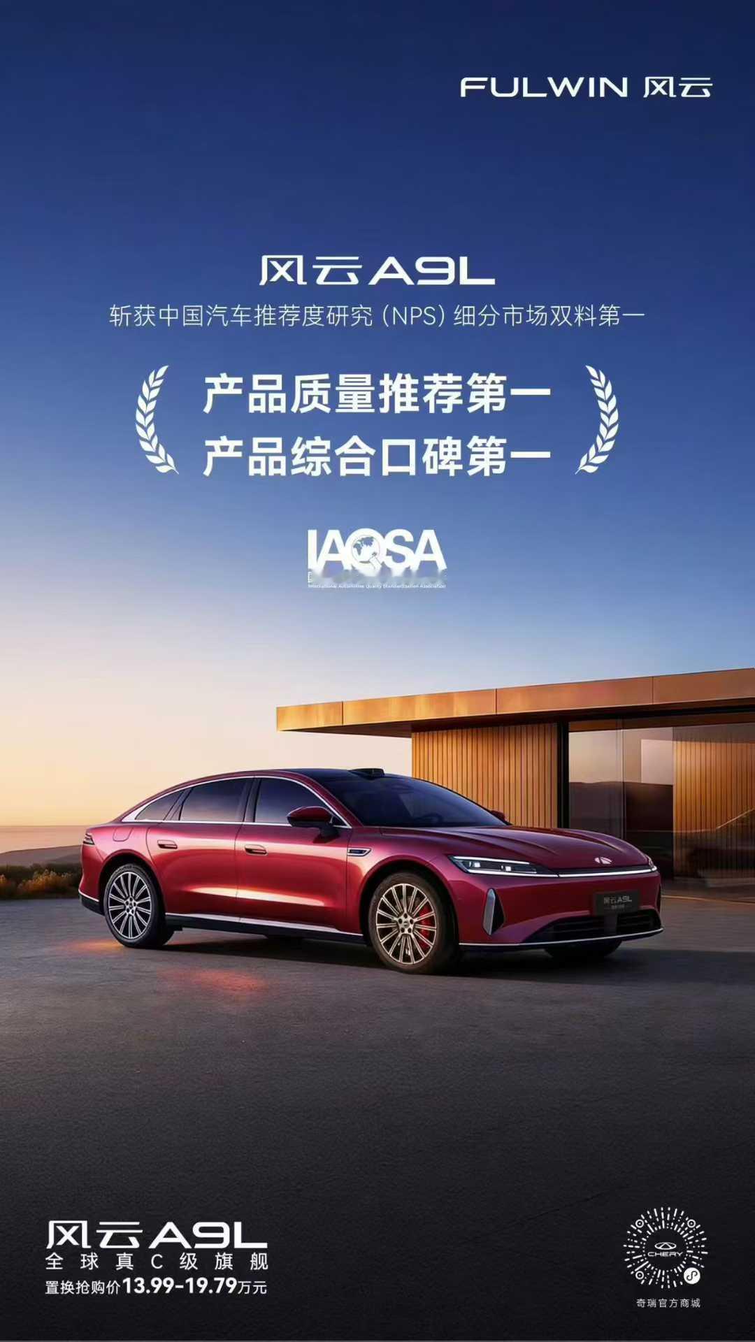 奇瑞风云A9L斩获中国汽车推荐度研究(NPS)细分市场产品质量推荐暨产品综合口碑第一