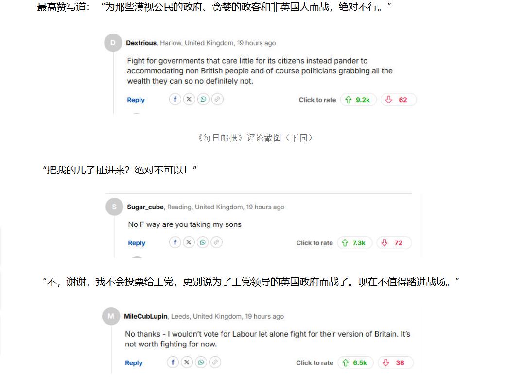 英国高级将领呼吁“牺牲儿女”,英网友:不想为腐败政客而战 这帮欧洲军政高层,为了延续战争,终于把主意打到了孩子身上。 前段时间,法军总参谋长比安-曼东说,如果法国人民不愿意牺牲儿女,在经济上受苦,法国就会面临风险。现在,英国国防参谋长理查德-奈顿,也当上了复读机,拿出了同一套说辞。 奈顿说,俄罗斯直接攻击英国本土的可能性很低,但永远不会是零。英国人民要为战争做好准备。 具体方式是,鼓励学生选择军工产业相关的专业,让儿女做好参军的准备,还有勒紧裤腰带过日子,确保英国政府有足够的国防开支。奈顿说,每个英国家庭都需要为国牺牲,从年轻人到儿童,都是如此。 能把话说到这个份儿上,这些军工复合体的代言人啊,吃相也是够难看的。咱们且不说,俄罗斯有没有进攻欧洲的计划,单说让民众承受经济上的牺牲,这些省出来的钱,是不是被军工复合体装进了自己的口袋? 俄乌冲突打了三年多,欧美各国没少给乌克兰送钱,泽连斯基那边不仅丧城失地,还接连爆出贪腐丑闻,难道你们欧洲人,不知道怎么吸取教训吗? 对此,英国网友看得很清楚,在这条新闻下面猛烈抨击奈顿,最高赞的评论是,我们绝不会为漠视公民的政府、贪婪的政客和非英国人而战。 这句话,直指问题的本质,斯塔默自上任以来,支持率创下历史新低,超过73%的选民认为他不胜任当前工作,只差上街游行,赶他下台。 同样,法国总统马克龙、德国总理默茨的支持率,也屡创新低。他们说的话能否代表民众意愿,可想而知。 回顾历史,其实绝大部分的战争,都是由政客、军方将领等少部分人挑起来的,民众绝大多数时候,都是被裹挟。 以前资讯不发达,普通人可能意识不到这一点,现在他们还想继续骗民众去送死,可就没那么容易了。