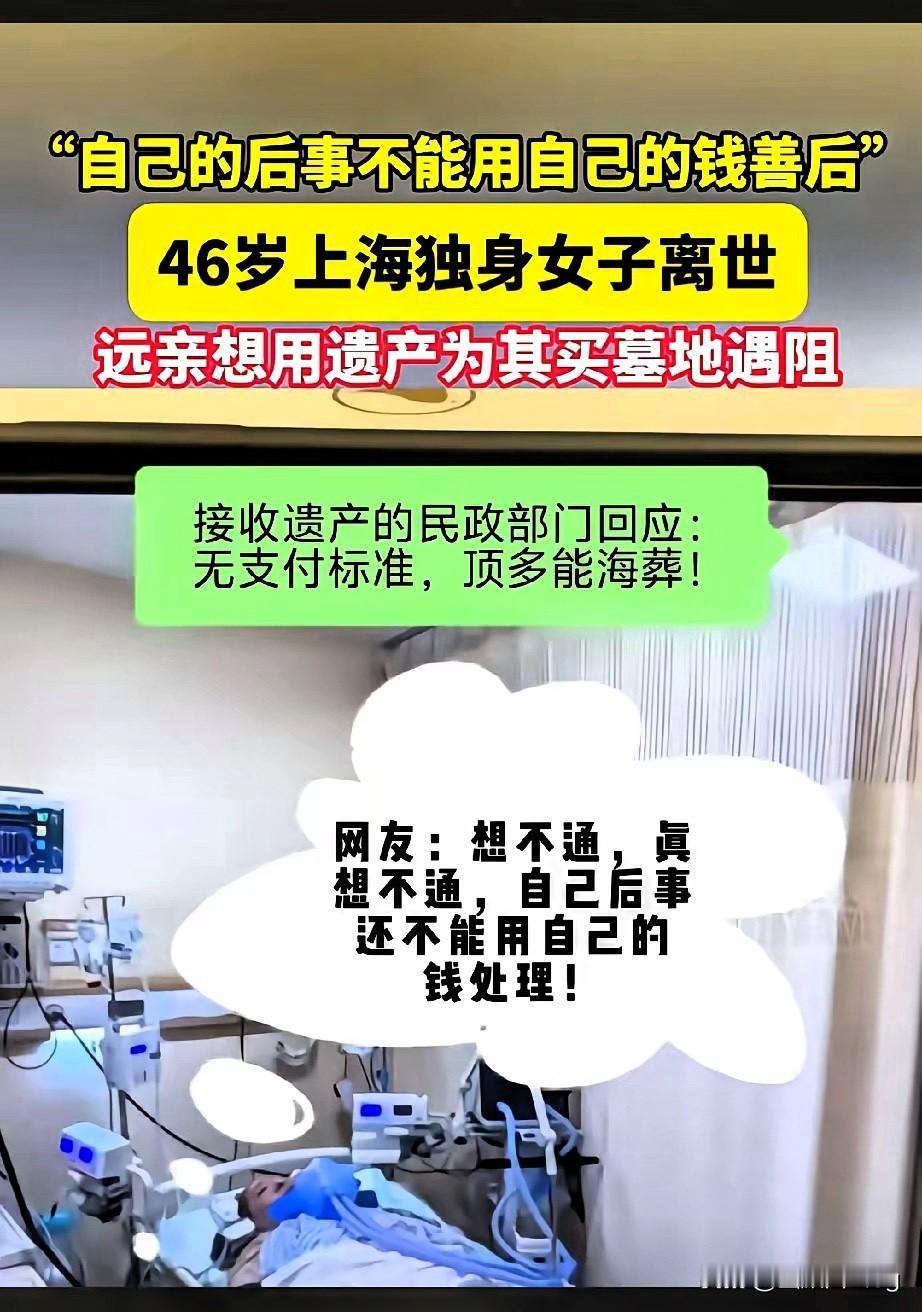 你还敢硬扛着单身不婚、坚决不生孩子吗?上海46岁蒋女士的遭遇,戳中了无数人的软肋! 父母早逝、无婚无子、没近亲属,突发脑溢血离世后,遗产归国家所有,远房亲戚想拿她的钱买块墓地都要走法院审批,社区只能默认海葬。 这事儿根本不是“单身不婚有错”,而是提醒我们:选择哪种生活都要提前规划。现在有遗嘱、遗赠扶养协议,还能指定遗产管理人,提前安排好身后事,就不会陷入这般被动。 真正的安全感从不是婚姻或孩子给的,而是把人生主动权握在自己手里。你觉得独居或不婚族,最该提前做好哪些保障?