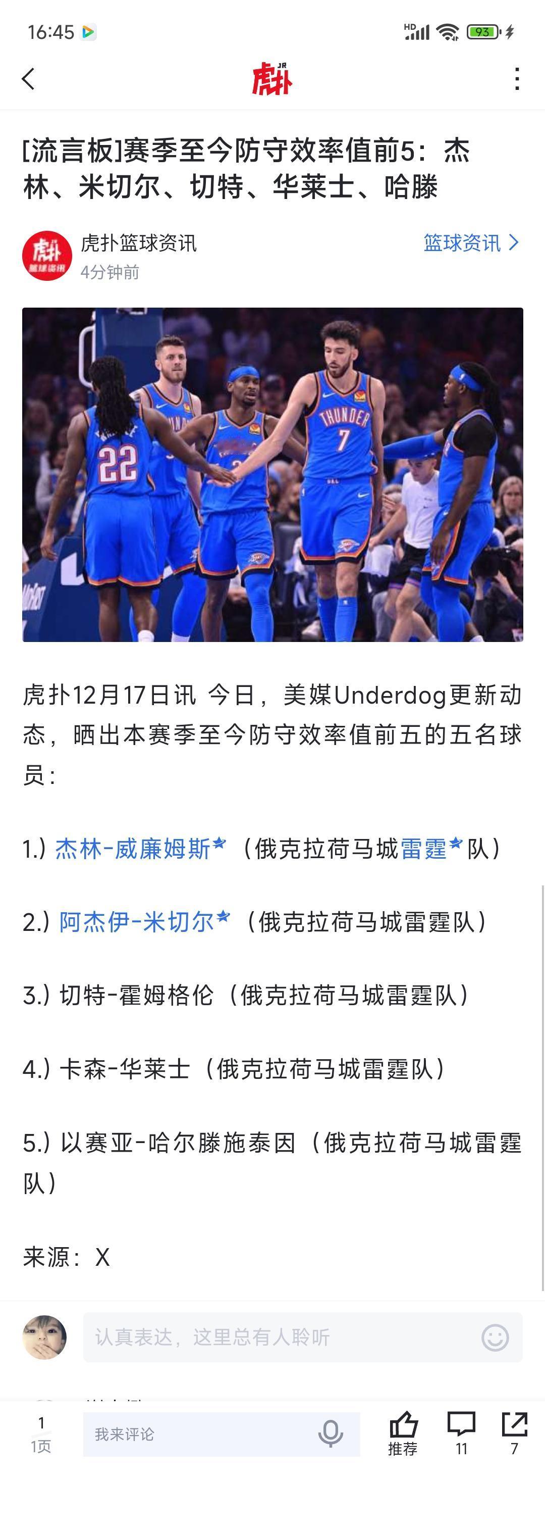 我没看错这个新闻吧,本赛季防守效率前五球员,全是雷霆球员! 这样看来不需要亚历山大,他们都是联盟最强。 幸亏湖人不争冠,凯尔特人也不争冠,联盟没人跟他们争冠,不必担心被虐。[捂脸]