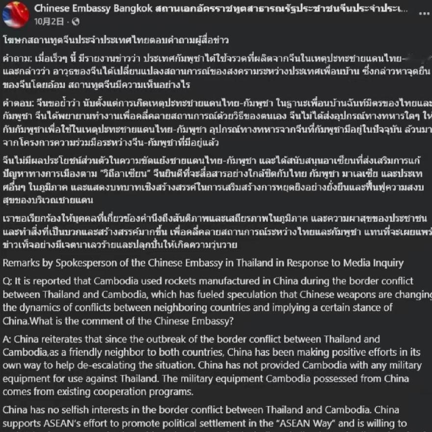12月17日,新加坡《海峡时报》报道:“泰国军方昨天对媒体称,已缴获柬埔寨装备的大量中国产反坦克导弹,中国外交部周三表示,中柬、中泰均有正常防务合作,不针对第三方且与边境冲突无关,中方未向柬埔寨提供冲突相关军事装备,柬方所持中国装备均来自以往的既有合作项目。” [机智]武器成焦点?别让冲突跑偏对华合作本质!泰柬边境冲突中,中国产反坦克导弹被缴获沦为舆论焦点,本质是借武器归属转移冲突核心,中方早已明确,相关装备源于既往正常防务合作,与当前冲突无涉,既不针对第三方,更非冲突导火索!两国边境争端需靠双边协商解决,将中国装备当话题工具毫无意义,中国与周边国家的防务合作,始终遵循不干涉内政原则,旨在助力伙伴国维护安全,动辄拿装备归属做文章,反而会模糊冲突根源,不利于局势降温,真正该聚焦的,是停止交火、回到谈判桌,而非炒作无关的武器话题!