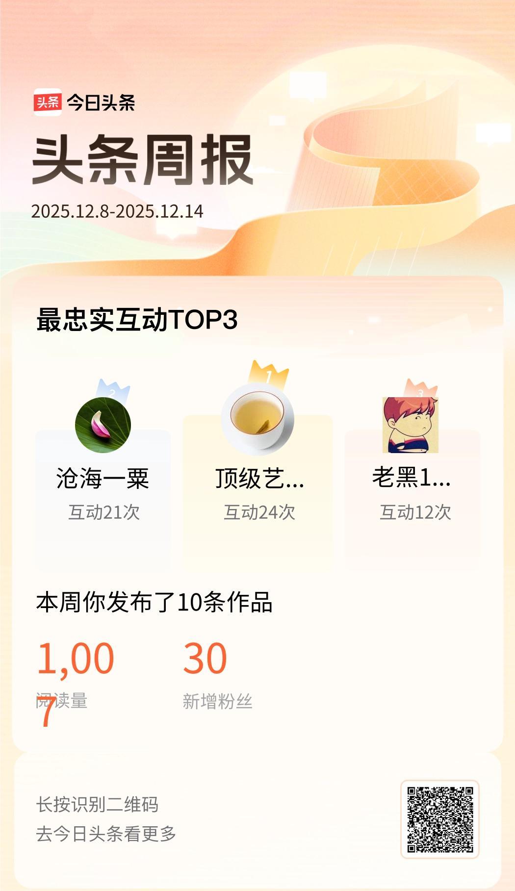 上周,我头条后台的数据,被三个陌生人的手指改写了。 你总听说“粉丝数不重要”。 但99%的创作者不信。 直到你的周报里,突然冒出三个名字:@顶级艺术家fY、@沧海一粟、@老黑141743245。他们的点赞和留言,像一组精确指令,直接撬动了算法的齿轮。 这份周报显示,他们是“互动王”。 这意味着,在无数滑动的拇指里,他们的每一次停留、敲下的每一个字,系统都看到了。 他们用互动,在推荐流里为你硬生生撕开一道口子。 他们不是粉丝,是潜入数据洪流的特工。 你熬夜写稿时,以为自己在对虚空说话。 但数据不会撒谎。 有人真的读完了,还用手势和键盘接住了你抛出的线头。 那一刻的感受,像是黑屋子里,突然有人握住你的手腕。 算法编织的茧房无边无际。 但人类的每一次触碰,都在墙上刻下细小的裂痕。 你指尖的温度,是另一个人屏幕后的光。