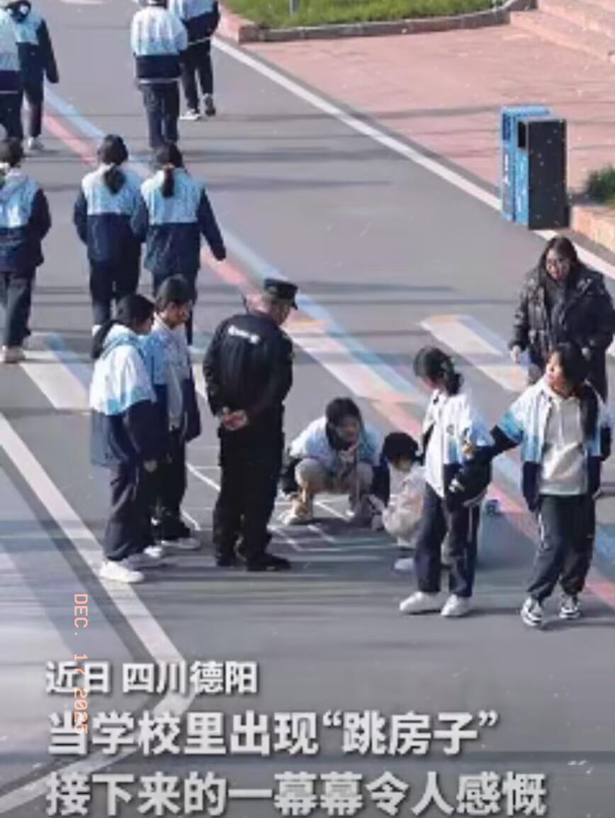 笑着笑着就哭了!德阳两女生课间画跳房子,竟引来全校人集体“返场童年” 四川德阳一所高中的课间两个女生随手在必经路上画了个粉笔画跳房子,没想到竟上演了一幕又暖又戳心的画面! 第一个路过的是割草工人,他低头赶路时瞥见格子脚步顿了顿,回头望了望犹豫两秒还是跨了过去——大概是手头的活还没干完没舍得停下脚步。 下课铃一响学生们蜂拥而至!一个男生眼睛瞬间发光,二话不说跳了进去单脚蹦、双脚落、转身捡“石子”一套动作行云流水,围观同学跟着起哄指点“你跳错啦!”,嬉笑声洒满了整条走廊直到上课铃响才恋恋不舍散去。 更戳人的还在后头!学校保安巡逻路过,四下张望确认没人小心翼翼抬起腿跳了起来,动作有些僵硬,却每一步都透着认真。跳完后他拍拍裤腿,嘴角藏不住笑意转身继续巡逻。 没过多久几位老师也走了过来,看着地上的格子,竟也忍不住跳了进去。她们跳得很慢,每落一步都像在打捞尘封的记忆,跳到最后一格时,都不约而同地停住了脚步望着前方出神。 视频传到网上评论区直接破防:“看到保安跳我笑了,看到老师跳我哭了”“他们好像跳错了,没跳回去;又好像没跳错因为童年本来就回不去了”。 一块粉笔画的格子装下了几代人的青春啊!