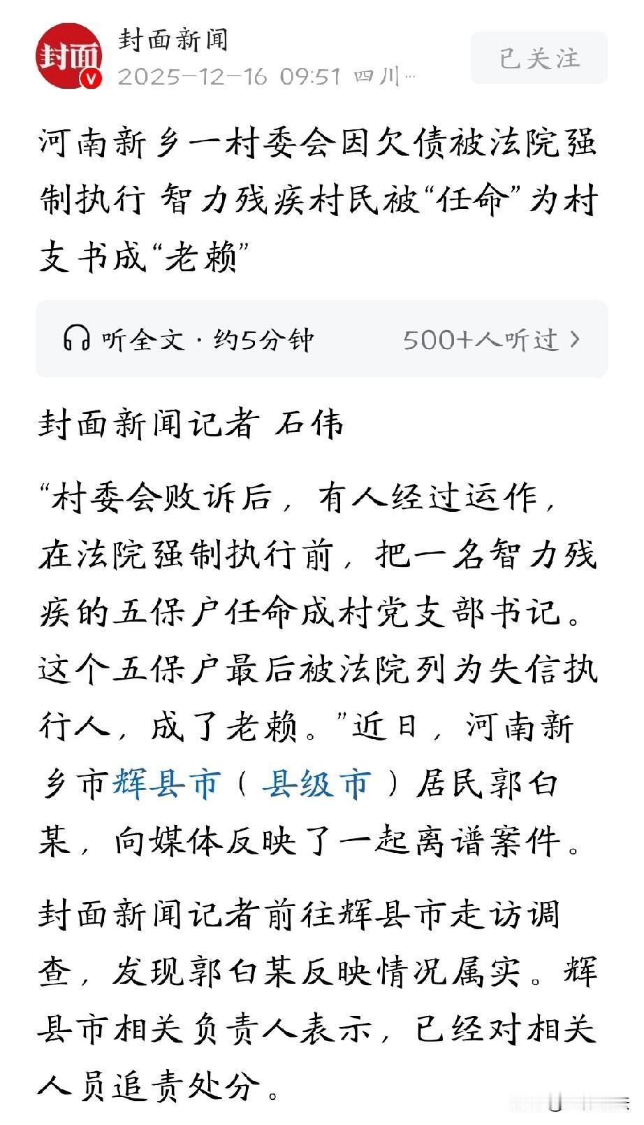 好一招金蝉脱壳!河南新乡,男子担任村书记期间,为了维持村上的正常运转,他只能先自掏腰包,多年下来,垫了70多万元。男子卸任之后,多次要求村委会还钱,但村里实在没钱,一直没还上。无奈之下,男子告上法庭,经过三审,判决村委会返还男子78万元。万万没想到,法院准备执行时竟然发现,村支书竟莫名其妙变成了村上一名61岁智力残疾的老人,而这背后的真相更是让人大跌眼镜。 郭某是某村村民,早些年,他在外地做生意,打拼多年,攒下了一些积蓄。 2002年,他回到村里,看着村里的现状,有些心疼,便挑起了村委会主任和党支部书记的重担,想带着大家过上好日子。 新官上任三把火,郭某任职那几年,干得风风火火,但村里财政状况实在是糟糕,日常运转处处要钱。 无奈之下,郭某只能先自掏腰包垫上,就盼着村子能正常发展之后,再慢慢把钱收回来。几年下来,他搭进去了大几十万。 可谁能想到,郭某脑子犯了糊涂,后来因为违反财经纪律、挪用资金、非法占有集体财产等违规违纪行为,背了处分,最后还被免了职。 2022年,已经不是村书记的郭某想着,自己已经从岗位上下来了,但之前给村里垫的钱可是真金白银,总不能打水漂。 于是,他多次找到村里,希望能尽快还钱,可是,村里状况堪忧,实在拿不出这笔钱,就一直拖着没给。 多次讨要欠款无果后,他一咬牙,直接把把村委会和当时村书记帖某告上了法院。 很快,法院作出了一审判决,判定村委会返还郭某78.1万余元。 一审判决下来后,书记帖某心里不服,再次提起上诉。 二审法院经过审理,认为一审法院审理不当,郭某和村委会之间不属于民间借贷关系,这案不能按照一般的民事案件受理,于是,撤销了一审判决。 郭某咽不下这口气,借钱就得还,这是天经地义的事情,便向高院提出上诉。 高院裁定,认定这属于民间借贷纠纷。 《民法典》第667条规定:借款合同是借款人向贷款人借款,到期返还借款并支付利息的合同。 郭某任职期间为村集体事务自掏腰包垫资,本质是其与村委会之间形成事实上的借款合同关系。 郭某提供资金用于村集体运转,村委会接受并实际使用该资金,双方虽无书面借款合同,但存在资金交付、用于集体事务的客观事实,符合借款合同的核心构成要件。 最终,中院依法撤销了之前的裁决,维持了一审判决。 本以为事情到这儿,就该有个圆满结果了,郭某万万没想到,他收到的裁定书中竟写着,原本的村委会法定代表人,也就是村支书竟然从帖某变成了村民郭黑某。 他整个人都傻眼了,简直不敢相信自己的眼睛,赶忙跑去法院核实情况。 法院拿出两份材料,表示镇上提供给法院的文书里面,白纸黑字写着,帖某在4月份就已经辞去了村书记职务,5月份镇上就下发了红头文件,任命郭黑某担任书记。 一听这话,郭某顿时火冒三丈,书记如果换成其他人他能相信,但换成郭黑某,那是万万不可能的。 原来,郭黑某是郭某的同族堂弟,最关键的是,他智力有残疾,一直靠着低保过日子,连自己都照顾不好的人,怎么会当村支部书记? 这明显就是有人搞鬼,想让一个智力残疾人来顶包当老赖,这招金蝉脱壳,实在是太荒唐了。 为了验证郭某的说法,随后记者找到了61岁的郭黑某。 郭黑某表示,自己小时候从树上摔下来,脑袋摔坏了,后来办了二级残疾证书,平时主要靠低保过日子,有时候也会打点零工。 对于当书记一事,他一脸茫然,说村里人都拿他开玩笑,说他成了书记了,可他连自己啥时候当的都不知道,从来都没人跟他说过。 好多村民都表示,听说过郭黑某当书记这事儿,就像在听一个天大的笑话。 对于此事,帖某只在电话里轻描淡写地表示,他不清楚。 那这到底是怎么回事呢? 原来,帖某原本是市上某局的普通职工,后来到村里担任书记,本想着提升履历,万万没想到,竟然碰上了这场官司。 为了躲避成为被执行人,他借助职务之便,和镇上的人勾结在一起,伪造了所谓的任命通知,还把这份红头文件提交给了法院。 对于此事,相关负责人表示,他们已经做了严肃处理,对帖某、镇上公章管理者以及镇长进行了党纪政纪处分。 即使这样,郭某还是觉得憋屈,一波三折,可自己的钱一毛也没有回来。 那郭某的钱到底能要回来吗? 《民法典》第119条规定:依法成立的合同,对当事人具有法律约束力。 郭某的垫资行为系为村集体利益,村委会作为接受资金的一方,应受该事实合同约束。 帖某以村委会名义应诉并试图逃避债务,以及后续伪造任命等行为,均不能否定村委会与郭某之间合法有效的债权债务关系。 所以,村委会仍需承担返还78.1万元垫资款的合同义务。