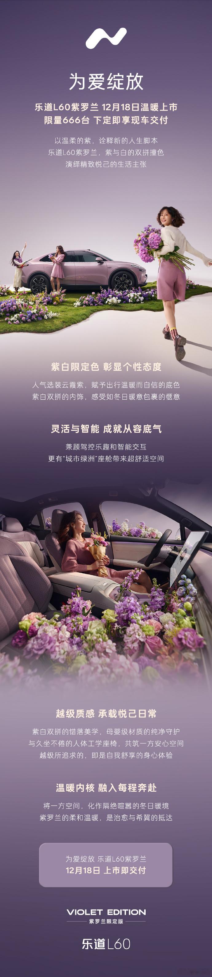 乐道l60 紫罗兰,紫白双拼限定配色,限量666台,12月18日上市即交付!乐道汽车