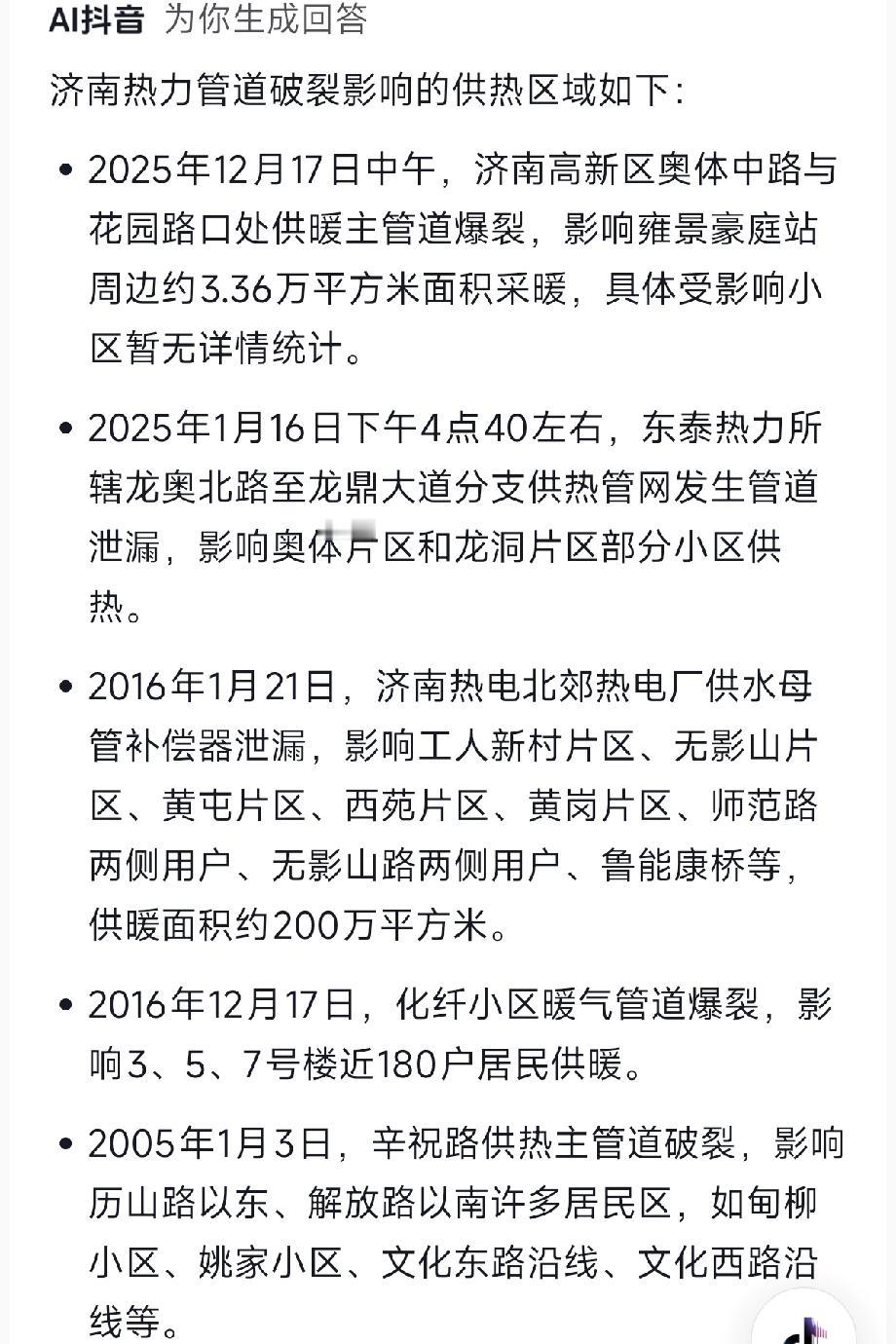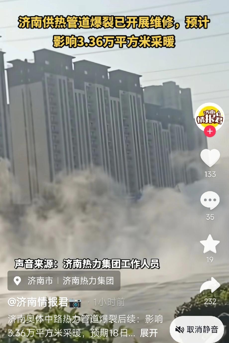 妈呀!这地面窜出来10多米高的水柱,近距离看,还是挺吓人的,据说是济南那边的道路热力爆管了! 现在及时控制住了,不过要维修这样的管道肯定是不小的工程了,听说这块供暖供的有三万多平方米呢!这一维修,这附近的住宅是不是得暂停供暖呢?如果真的要暂停,附近居民这几天恐怕要自己供暖了,交上去的供暖费也得有个说法了吧[抠鼻]大家怎么看?