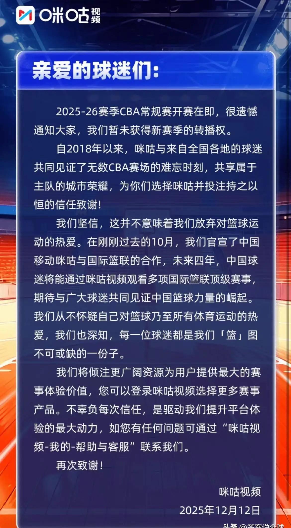 咪咕报价腰斩,CBA转播一夜崩盘! 抖音免费直播,揭幕战5001万人挤爆服务器。 你装三个APP才能看全赛季。 抖音抢走70%年轻用户,但只播精选场;央视握紧解说权,地方台死守主队。 全场次直播? 没人敢接这个盘。 球迷腿跑断:追互动上抖音,要专业蹲央视,挺家乡锁地方台。 商业谈判撕开裂口,观赛体验碎成一地。 这不是选平台,是拼耐心。 爱篮球,却要在碎片里挖完整赛季。