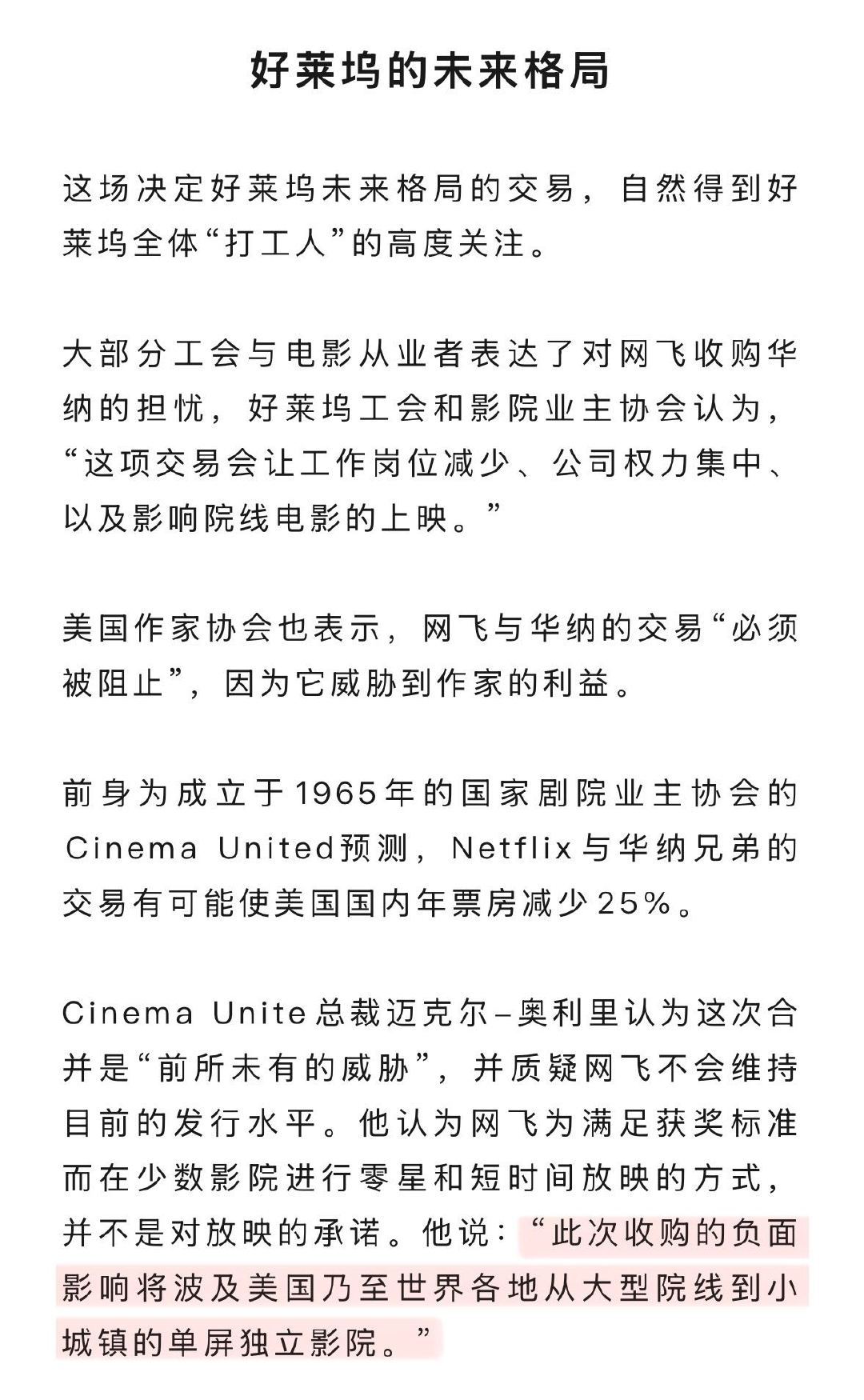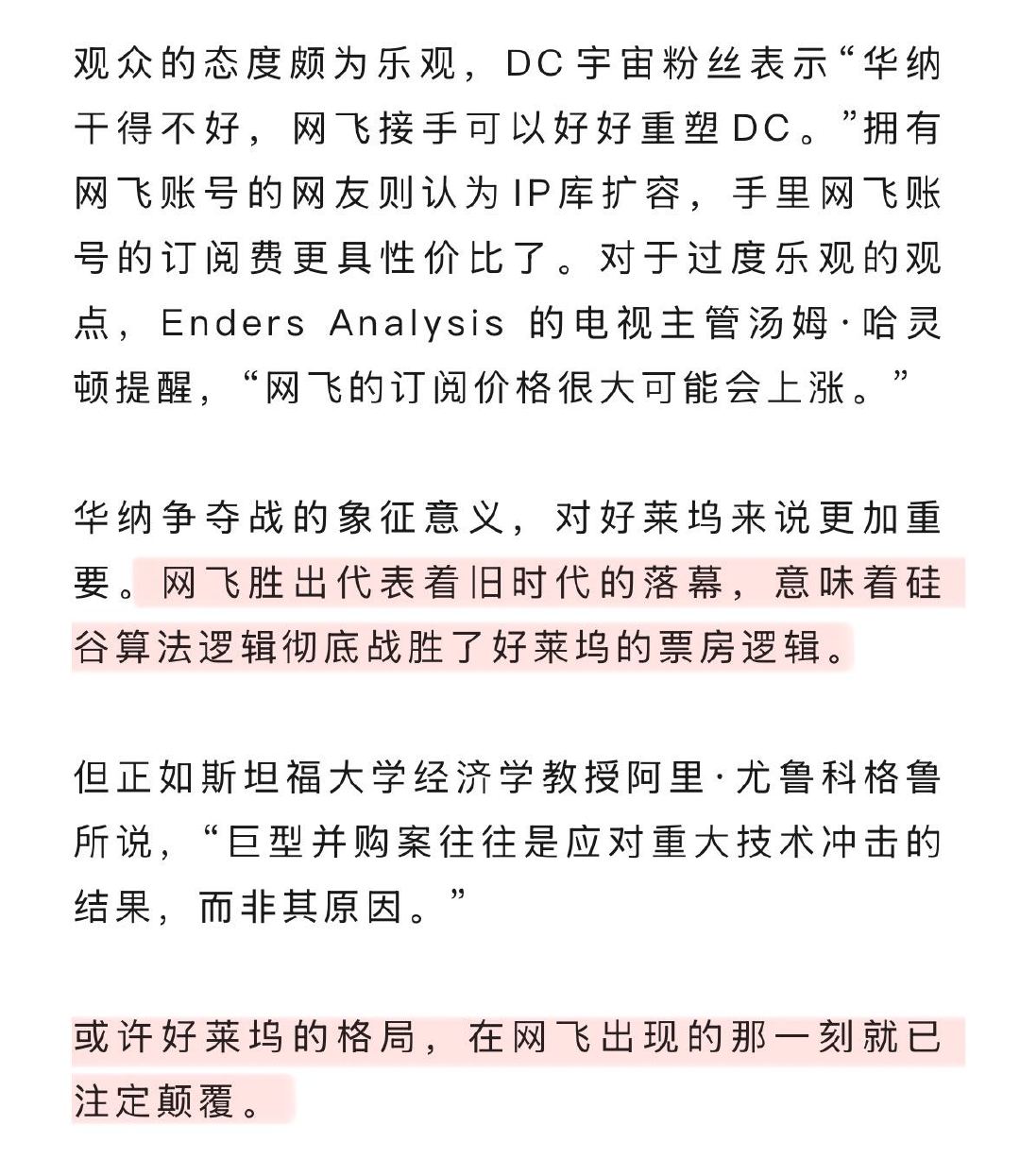 华纳兄弟为何要卖身好莱坞未来格局华纳争夺战的象征意义,对好莱坞来说更加重要。网飞胜出代表着旧时代的落幕,意味着硅谷算法逻辑彻底战胜了好莱坞的票房逻辑。 但正如斯坦福大学经济学教授阿里·尤鲁科格鲁所说,“巨型并购案往往是应对重大技术冲击的结果,而非其原因。”