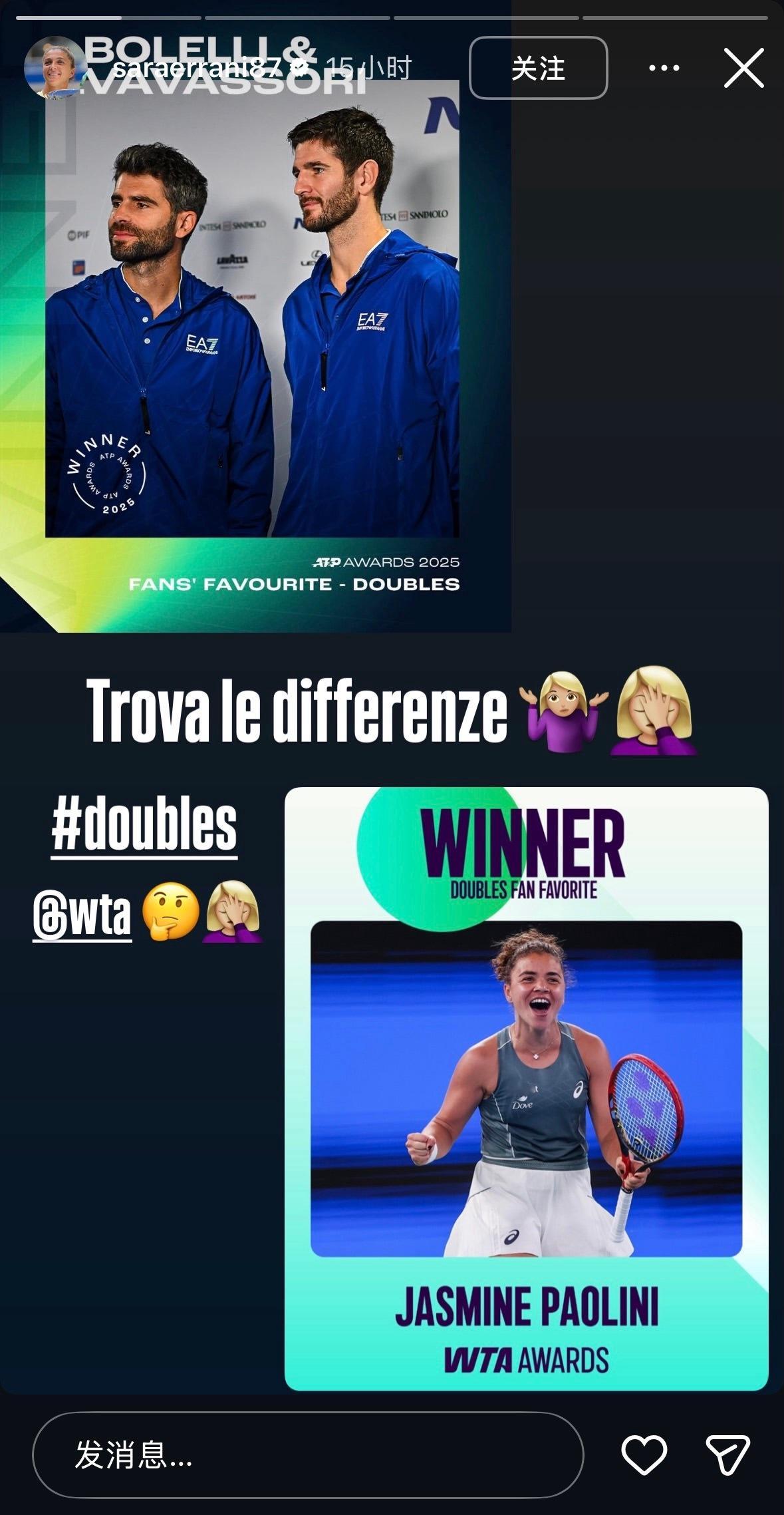 埃拉尼质疑WTA,为何评选最受欢迎双打选手,只选一个人,而不是像ATP一样选一个