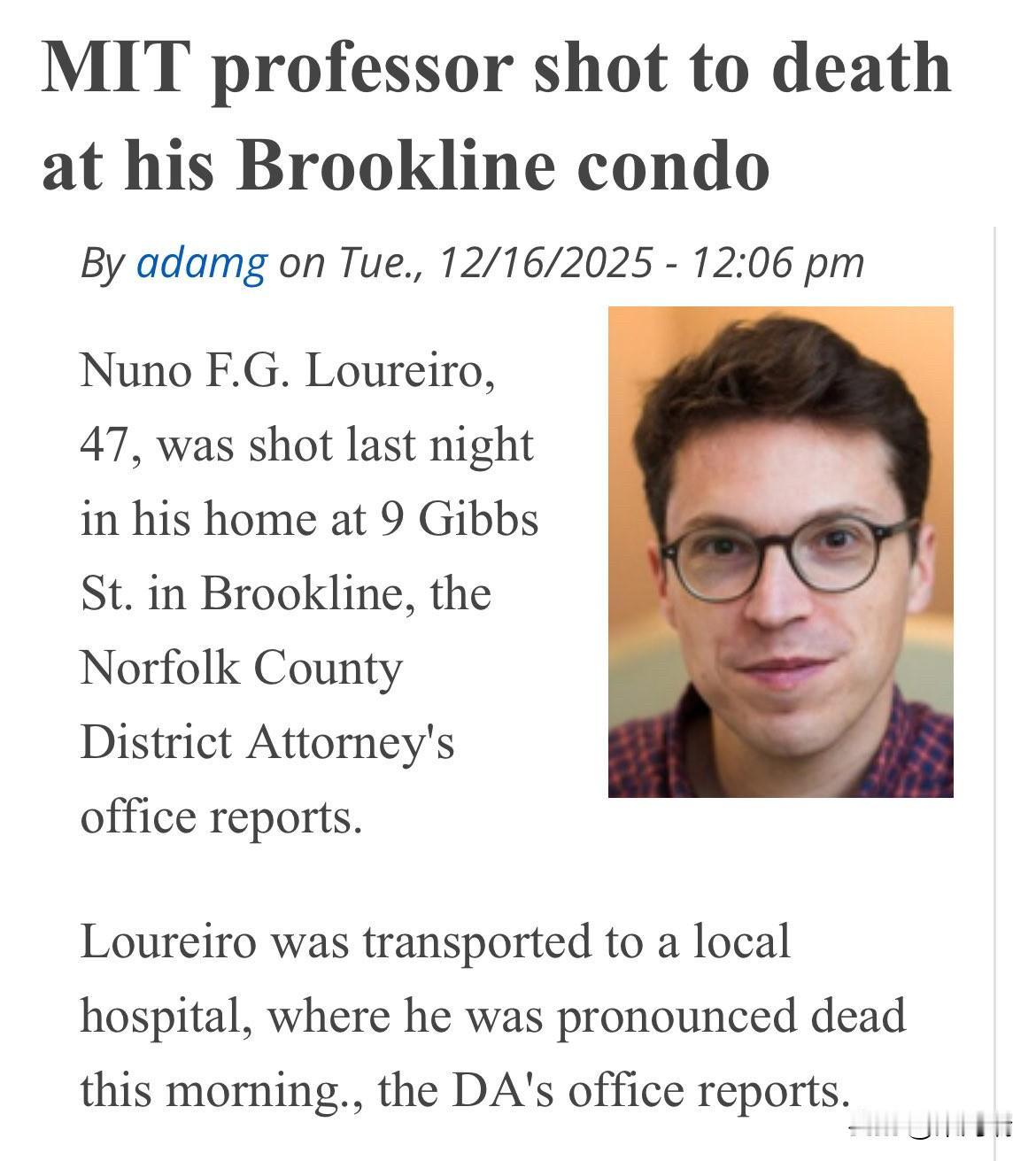 麻省理工学院(MIT)教授 Nuno F.G. Loureiro 在其布鲁克林(Brookline)的公寓中被枪杀,警方正在调查此案。 47 岁的 Nuno F.G. Loureiro 是一位葡萄牙裔理论物理学家和聚变科学家,也是麻省理工学院等离子体科学与聚变中心的主任。 他于周一晚上(2025年12月15日)在位于布鲁克林吉布斯街(Gibbs Street)9号的家中被枪击。他被送往当地医院,并于周二早上被宣布死亡。截至周二下午,尚未逮捕任何嫌疑人。 邻居们形容 Loureiro 和他的家人是“你能遇到的最好的人”。联邦调查局(FBI)表示,目前没有证据表明该事件与几天前在布朗大学(Brown University)发生的枪击案有任何关联。