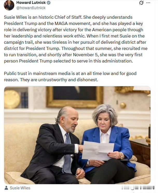 美商务部长霍华德·卢特尼克: 苏茜·怀尔斯是一位具有历史意义的白宫幕僚长。她对特朗普总统以及 MAGA 运动有着深刻的理解,并凭借她的领导力和不知疲倦的工作精神,在为美国人民赢得一场又一场胜利的过程中发挥了关键作用。 我第一次在竞选途中见到苏西时,她就为了帮助特朗普总统拿下一个又一个选区而日夜奔忙、毫不懈怠。那个夏天里,她招募我负责过渡工作;而在11月5日之后不久,她也是特朗普总统亲自选定、首位加入本届政府的人选。 公众对主流媒体的信任已经跌至历史最低点,而且这是有充分理由的——他们不值得信任,也不诚实。