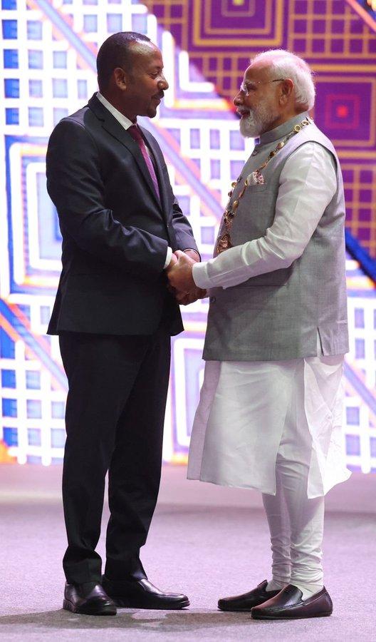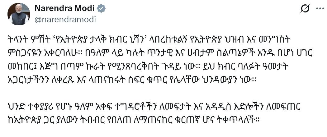莫迪:我谨向埃塞俄比亚人民和政府致以衷心的感谢,感谢他们昨晚授予我“埃塞俄比亚最高功勋勋章”。能够得到世界上最古老、最富饶的文明之一的认可,我感到无比荣幸。这份荣誉也应归功于多年来无数印度同胞,是他们塑造并巩固了我们之间的伙伴关系。 印度将继续致力于进一步加强与埃塞俄比亚的伙伴关系,以应对不断变化的全球挑战并创造新的机遇。